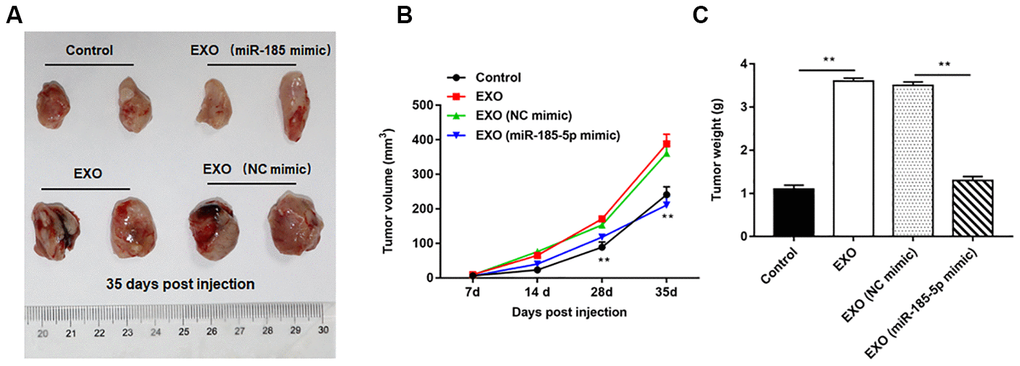 Nude mice tumor bearing models were constructed by intraperitoneal injection of A549 cells, and the normal saline, A549 cell-derived exosomes, A549 cell (transfected with NC mimic)-derived exosomes and A549 cell (transfected with miR-185-5p mimic)-derived exosomes were injected into nude mice, respectively. We observed that A549 cell-derived exosomes induced tumorigenesis more readily than A549 cells, as indicated by the larger volume and weight of the tumors formed in nude mice, and the representative tumor images are shown in Figure 10A. Furthermore, the volume (Figure 10B) and weight (Figure 10C) of tumors formed by exosome treated nude mice derived from 549 cells overexpressing miR-185-5p were significantly reduced compared to those from exosome treated nude mice derived from normal A549 cells (transfected with NC mimic).