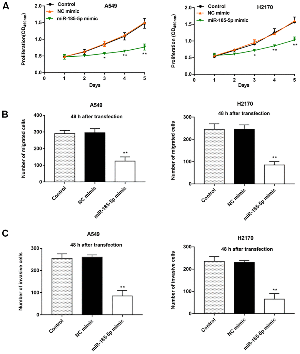 Our previous results showed that miR-185-5p was down regulated more fold in A549 and H2170 cells, therefore, we will deeply explore the regulatory role of miR-185-5p in tumor progression in these two types of cells. Then, A549 and H2170 cells were transfected with miR-185-5p mimic and the transfection efficiency was shown in Figure 1C, 1D. Furthermore, we observed that the proliferation ability of A549 and H2170 cells was attenuated upon transfection of miR-185-5p mimics (Figure 2A). Transfection of miR-185-5p mimic inhibited the migration and invasion of A549 and H2170 cells compared with the control (Figure 2B, 2C).