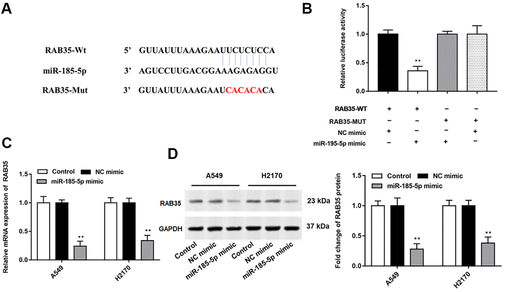 Bioinformatics databases (http://starbase.sysu.edu.cn/) were used to predict the potential target genes of miR-185-5p, and RAB35 was screened. We observed no binding relationship between mutated RAN35 and miR-185-5p (Figure 3A). Next, we found that miR-185-5p mimic reduced the luciferase activity of wild-type Rab35 but not mutant Rab35 (Figure 3B). Furthermore, the mRNA and protein expression levels of RAB35 in A549 and H2170 cells were significantly suppressed after transfection with miR-185-5p mimic (Figure 3C, 3D).