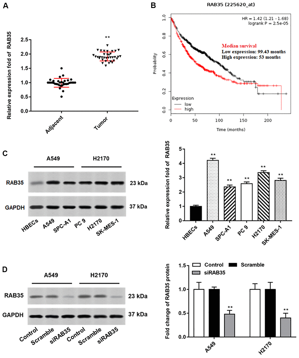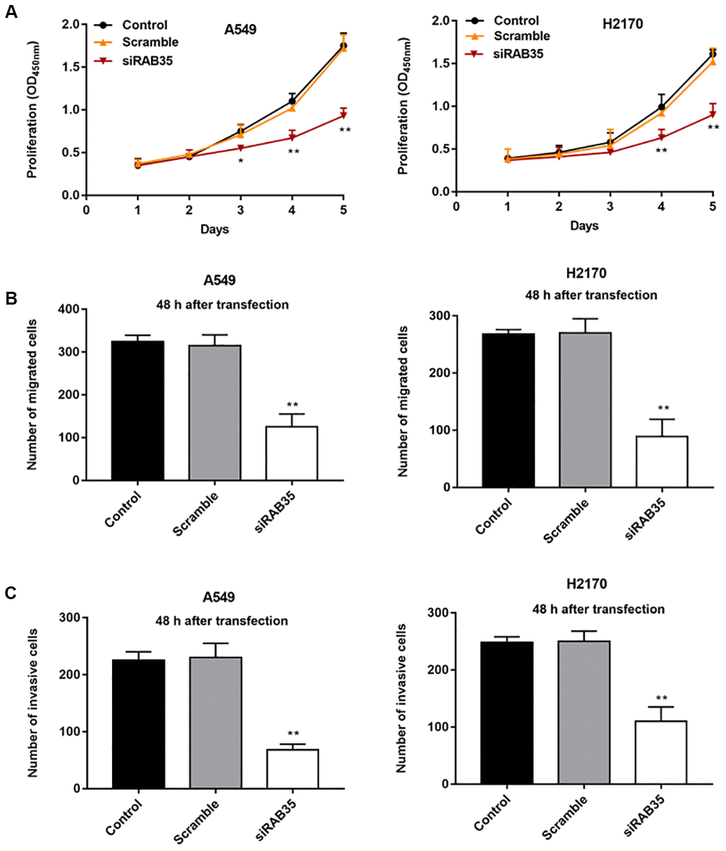 Then, we found that the expression of RAB35 was higher in tumor tissues than in adjacent tissues (Figure 4A). Moreover, biological database (http://kmplot.com/analysis/) exhibited the relationship between RAB35 expression and survival cycle in 1928 lung cancer patients, indicating that the median survival of patients with RAB35 low expression was 99.43 months, while that of patients with RAB35 high expression was only 53 months (Figure 4B). In different NSCLC cell lines, we similarly observed high levels of RAB35 expression (Figure 4C). Next, A549 and H2170 cells were transfected with RAB35 siRNA and the transfection efficiency is shown in Figure 4D. The proliferation ability of A549 and H2170 cells was attenuated upon transfection of RAB35 siRNA (Figure 5A). Transfection of RAB35 siRNA inhibited the migration and invasion of A549 and H2170 cells compared with the control (Figure 5B, 5C).