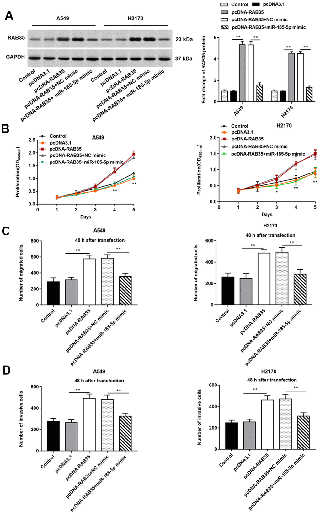 The A549 and H2170 cells were transfected with pcDNA-RAB35 alone or together with miR-185-5p mimic. We observed that pcDNA-RAB35 promoted RAB35 protein expression, and miR-185-5p mimic inhibited RAB35 protein expression (Figure 6A). Moreover, the pcDNA-RAB35 promoted cell proliferation in A549 and H2170 cells. However, the enhanced cell proliferation by pcDNA-RAB35 was reversed by miR-185-5p mimic (Figure 6B). The ability of migration and invasion of A549 and H2170 cells was enhanced by pcDNA-RAB35, but this change was partially abolished by miR-185-5p mimic (Figure 6C, 6D).