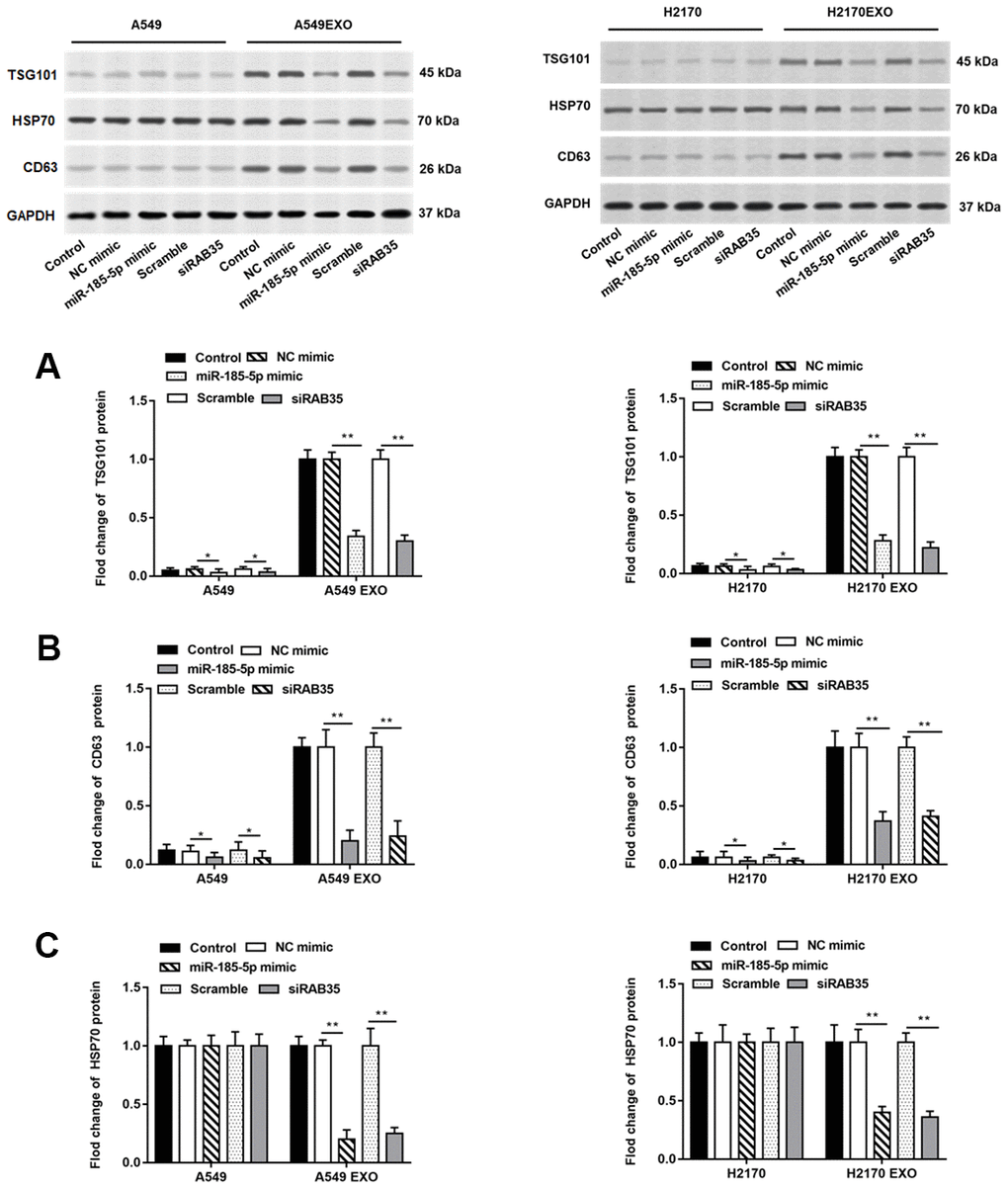 There have been numerous studies confirming that exosomes secreted by tumor cells promote or inhibit tumor progression by regulating tumor cell growth [15, 16]. It is well known that some proteins including CD63, HSP70 and TSG101 are markers for detecting exosomes. A549 and H2170 cells were transfected with miR-185-5p mimic and RAB35 siRNA for 48 h, and cell culture medium was collected and exosomes were extracted. We found that TSG101 and CD63 proteins were enriched in exosomes secreted by A549 and H2170 cells but not in A549 and H2170 cells. When overexpressing miR-185-5p or interfering with RAB35, we observed suppressed TSG101 protein and CD63 protein expression in tumor cells and their derived exosomes (Figure 7A, 7B). Moreover, HSP70 protein expression was reduced in exosomes secreted by tumor cells transfected with miR-185-5p mimic or RAB35 siRNA (Figure 7C).