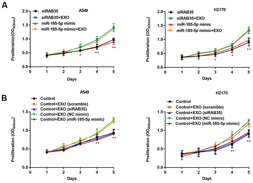 Exosomes secreted by A549 and H2170 cells were incubated with A549 and H2170 cells with knockdown of RAB35 expression. We observed that exogenous exosomes restored the proliferation ability of A549 and H2170 cells with knockdown of RAB35 expression (Figure 8A). Further, exosomes secreted by normal A549 cells (transfected with scramble or NC mimic) restored cell proliferation ability compared with A549 cells with knockdown of RAB35 expression (transfected with siRAB35 or miR-185-5p mimic), whereas exosomes secreted by A549 cells with knockdown of RAB35 expression (transfected with siRAB35 or miR-185-5p mimic) again inhibited cell proliferation (Figure 8B). The same results were validated in H2170 cells.