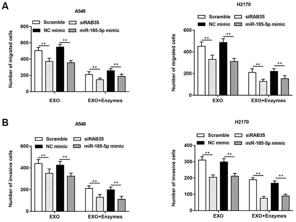 Exosomes secreted by A549 cells were treated with enzymes, and then the enzyme treated exosomes were co incubated with A549 cells with knockdown of RAB35 expression. We observed that cell migration (Figure 9A) and invasion (Figure 9B) were inhibited. The same results were validated in H2170 cells.