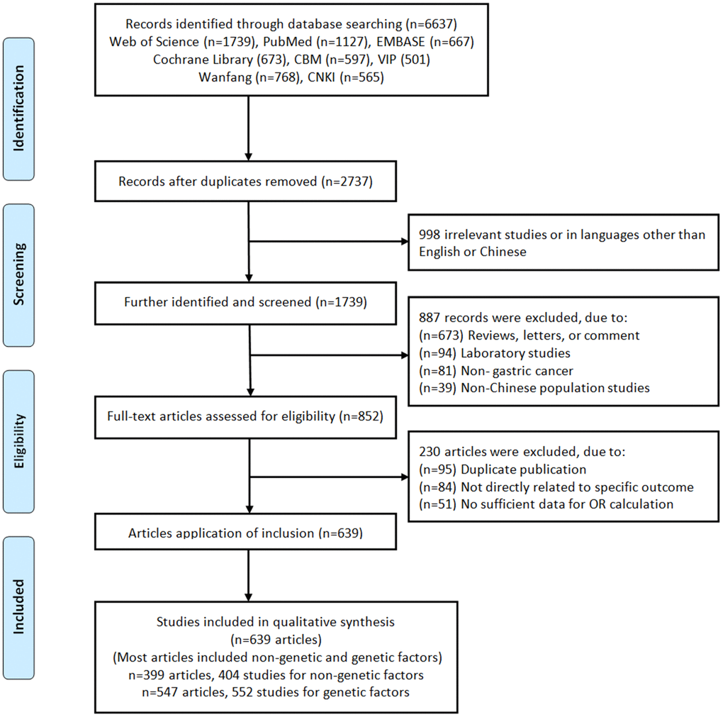 A flow diagram of the literature search strategy was summarized in Figure 1. Based on the search strategy, a total of 6,637 records were retrieved. Of these, 3,900 articles were excluded as duplicates, 998 articles were excluded as irrelevant (not related to risk factors or genetic variants). After screening the titles and abstracts, the remaining 852 eligible articles were assessed for full-text review. Due to most independent studies included non-genetic and genetic factors associated with gastric cancer, and therefore 639 articles (n=399 articles, 404 studies for non-genetic factors; n=547 articles, 552 studies for genetic factors) eligible articles were included in qualitative synthesis (Supplementary References). If an article contains two populations, we consider it as two independent studies. The SNP was eliminated if the number of studies involving it was less than 3. As a result, a total of 70 SNPs involving 48 genes were available. We calculated the Hardy-Weinberg equilibrium (HWE) based on the control genotyping data provided by the eligible study, and 114 studies (14 SNPs involved 10 genes) were excluded due to the non-HWE. Therefore, 56 SNPs involved 38 genes were quantitative synthesis.