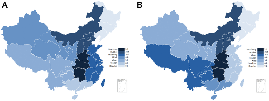 PubMed was used to identify GWAS associated with gastric cancer, resulting in a total of three GWASs (11 SNPs) [13–15], the11 SNPs were all located in 5 genes. Overall, data on 1161 polymorphisms involving 460 distinct genes were available. Most SNPs were located on chromosomes 1 and 8. The number of articles from Jiangsu Province was the highest (218), followed by Shandong (38) and Henan (37) Province. The distribution of H. pylori infection in the general population and gastric cancer based on China's regional division was shown in Figure 2A, 2B.