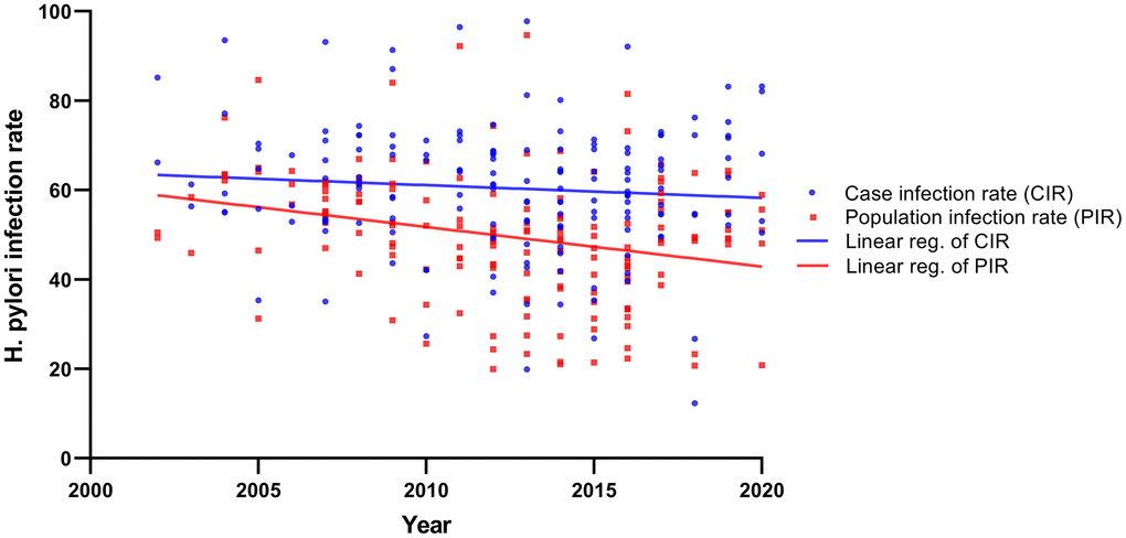 Demographic and environmental risk factors for gastric cancer were summarized in Table 1. H. pylori infection, smoking, drinking, family history, stomach disease, high salt diet, pickled food, fast eating, irregular meals, edible hot food, smoked and frying, spicy diet and mental depression were significantly associated with gastric cancer risk. Of note, the results showed that the risk of gastric cancer in diabetic patients was lower than that in the general population (OR = 0.76, 95% CI: 0.68-0.84), while hypertension (OR = 0.95, 95% CI: 0.88-1.01) and obesity (BMI, OR = 0.79, 95% CI: 0.53-1.21) were not associated with gastric cancer. According to the type of gastric cancer, the results showed that the risk factors for cardia and non-cardia gastric cancers were different (Table 1). Meanwhile, linear regression analysis showed that from 2000 to 2020, H. pylori infection rate showed a slowly downward trend in gastric cancer and population, and it was relatively obvious in the population (Figure 3).
