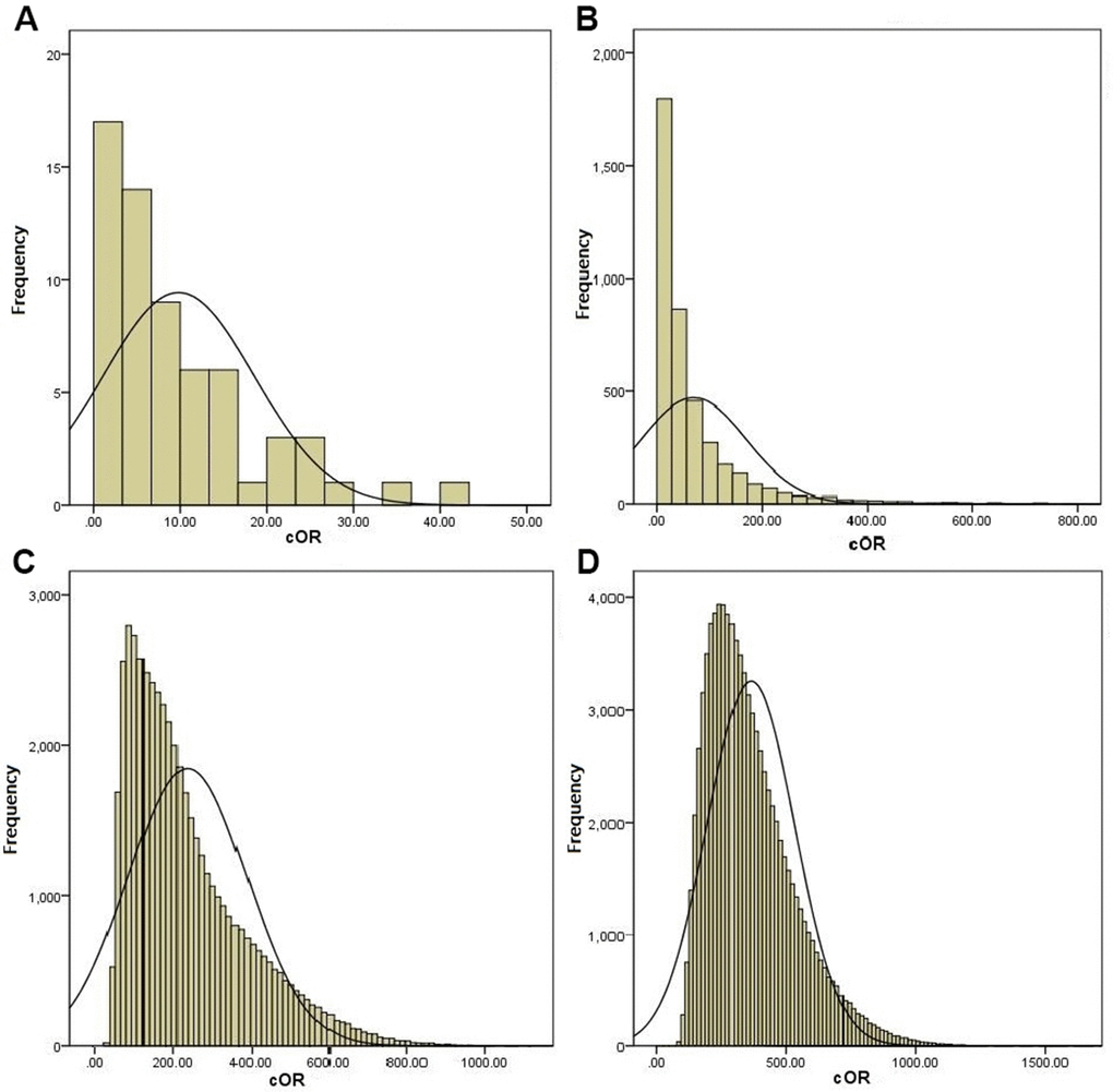 Among the significant associations identified by this synopsis, the level of summary evidence 3(13.64%) (PLCE1 rs2274223, PSCA rs2976392, MUC1rs4072037) were high and 19 (83.36%) (MTHFR rs1801133, COX-2 rs20417, XRCC1 rs1799782 and rs25487, XRCC3 rs861539, NAT2 rs1799930 and rs1799929, PLCE1 rs3765524, GSTM1, GSTT1IL-17A rs2275913 and rs8193036, PSCA rs2294008, PRKAA1 rs13361707, ERCC5 rs751402, TGFBR rs3773651, IL-10 rs1800896 and VDR rs731236) were intermediate level of summary evidence, respectively. The default value of FPRP critical value was 0.5, and the prior probability was set as 0.1, 0.01 and 0.001 respectively. Among the high-quality correlations, FPRP was the best for 22/22, 19/22 and 6/22 at 0.1, 0.01 and 0.001 levels, respectively. The details of significant associations characterized by a high or intermediate level of pooled evidence were summarized in Table 2. According to the main functions of genes, the distribution of genetic variants significantly related to the risk of gastric cancer were shown in Figure 4A–4D. As we add more susceptible genes into the model, the risk distribution gradually expands, and the population can better distinguish between high-risk and low-risk categories.