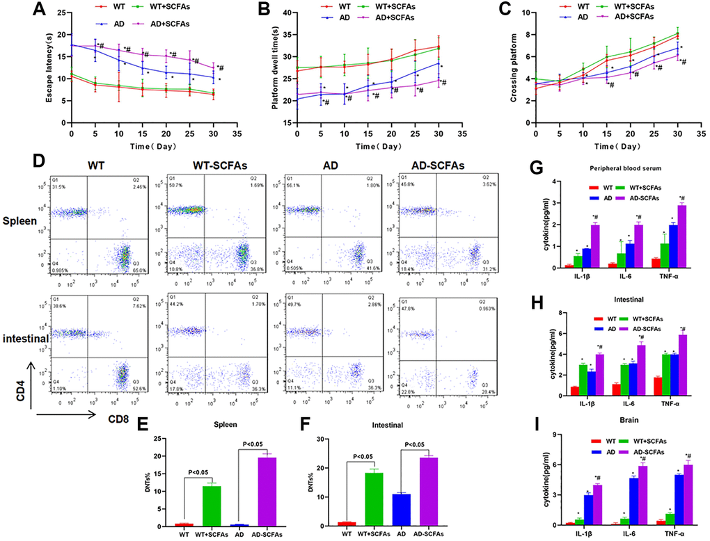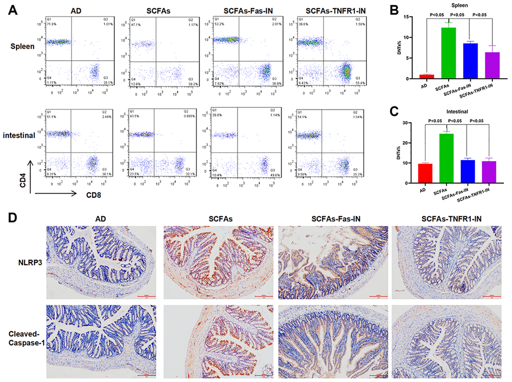 In this study, AD mice were used. AD mice were divided into AD, SCFAs, SCFAs + Fas-IN and SCFAs + TNFR1-IN groups. Fas-IN and TNFR1-IN were inhibitors (MCE, Shanghai, China), which were administered by intragastric administration once a day (50 mg/kg). Three groups of mice were fed with SCFAs. After 30 days, the mice were sacrificed by carbon dioxide asphyxiation, followed by extraction of intestinal tissue, spleen, peripheral blood and brain tissue. The following assays were performed accordingly: (1) the proportion of DNTs in mouse intestine and spleen; (2) detection of the expression of NLRP3 and Caspase-1 in intestinal tissue by IHC; (3) the expression of inflammatory factors (IL-1β, IL-6 and TNF-α) in the peripheral blood serum as well as intestinal tissue and brain tissue by ELISA; (4) the protein expression of NLRP3, cleaved-Caspase-1, ASC, Pro-Caspase-1 in intestinal tissue as well as IBA-1 and GFAP in brain tissue by WB.