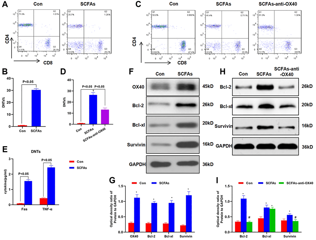 The isolated lymphocytes from the spleen were cultured with SCFAs. As a result, the proportion of DNTs was significantly up-regulated, while the proportion of DNTs without induction was low. When OX40 antibody was pre-treated to block OX40 signal, the proportion of SCFAs-induced DNTs was also down-regulated, which was significantly lower than that of the SCFAs group (Figure 5A–5D). The expression of TNF-α and Fas in DNTs was significantly up-regulated, indicating that DNTs could secrete inflammatory factors (Figure 5E). SCFAs could promote the expression of OX40, Bcl-2, Bcl-xl and Survivin, and promote the survival and proliferation of DNTs cells. OX40 antibody pretreatment could significantly suppress the expression of Bcl-2, Bcl-xl and Survivin (Figure 5F–5I).