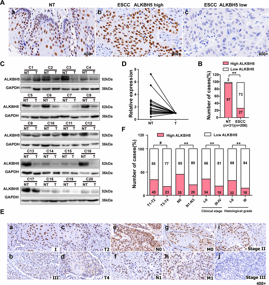 To study the involvement of ALKBH5 in ESCC progression, we first checked the expression of ALKBH5 protein in 206 paraffin-embedded, archived ESCC specimens and 31 adjacent non-cancerous tissues (NT) by immunohistochemistry (IHC). Low expression of ALKBH5 was detected in 1 NT sample (3%) (Figure 1A-a and Table 1) and 150 ESCC specimens (73%) (Figure 1A-b, c, 1B, and Table 1; P < 0.01). Western blotting revealed reduced ALKBH5 expression in 20 fresh ESCC specimens compared with adjacent non-cancerous tissues (Figure 1C, 1D). Furthermore, IHC revealed ALKBH5 protein to be primarily located in the nucleus of cancer cells (Figure 1A, 1E).
