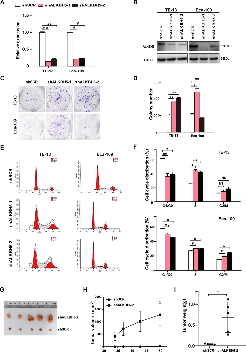 To further examine the growth-inhibiting effects of ALKBH5 on ESCC cells in vivo, we performed subcutaneous tumor xenograft experiments in nude mice. Vector- and ALKBH5-expressing Eca-109 cells or shSCR- and shALKBH5-expressing TE-13 cells were subcutaneously injected into the dorsal flank of nude mice. The tumor size (Figure 2G), tumor volume (Figure 2H), and tumor weight (Figure 2I) were noticeably larger in tumors induced by vector-expressing cells compared with those induced by ALKBH5-expressing cells. On the contrary, the depletion of endogenous ALKBH5 remarkably accelerated tumor growth in vivo (Figure 3G–3I). Altogether, these results demonstrated that ALKBH5 negatively regulated the in vivo tumorigenicity of ESCC cells.