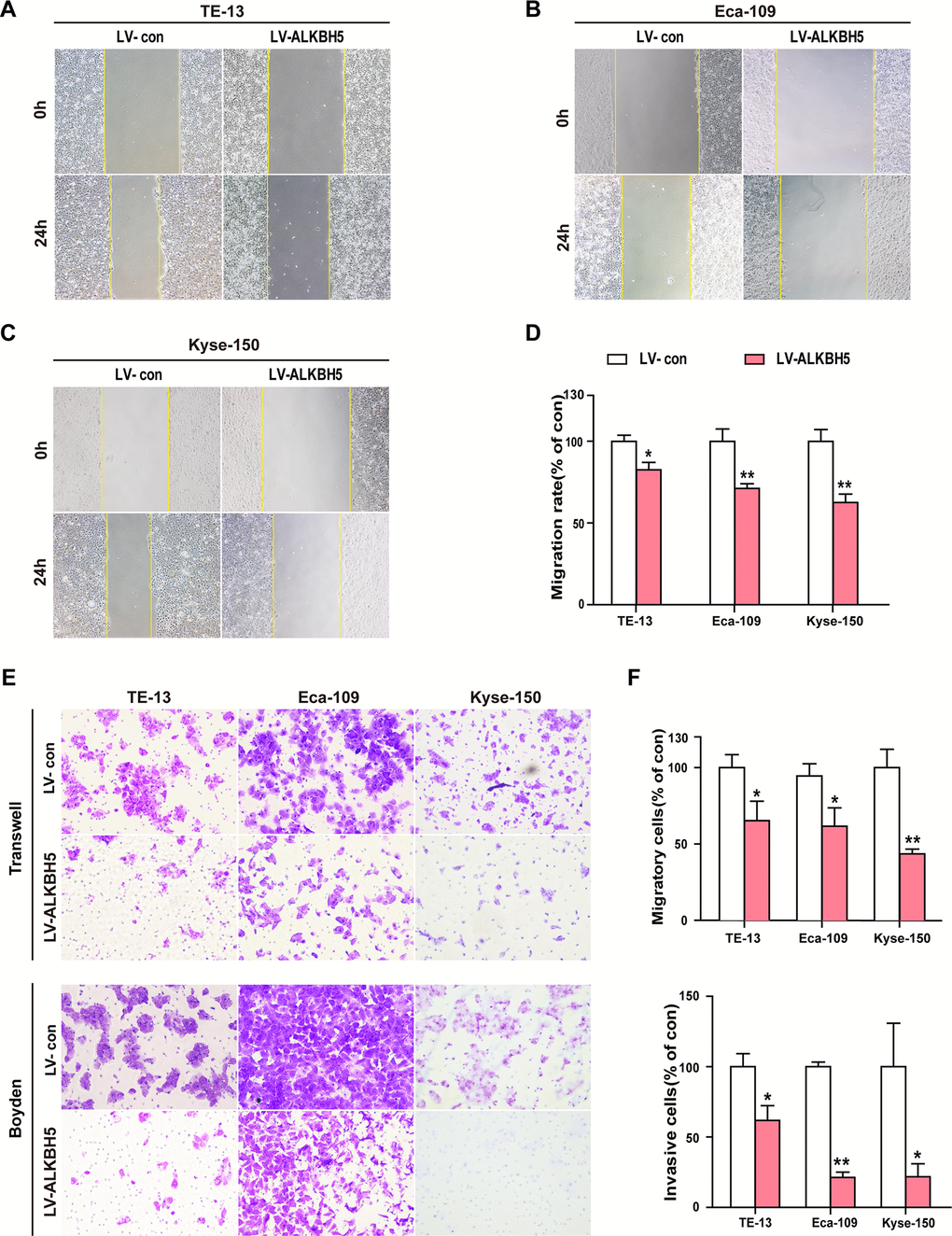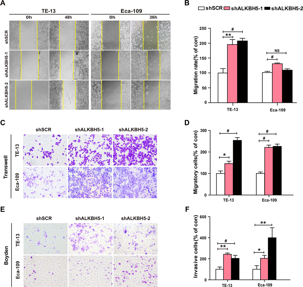 Transwell migration and Boyden invasion assays were performed using the methods described previously. For the transwell migration assay, vector- or ALKBH5-expressing ESCC cells (2 × 105) or shSCR- or shALKBH5-expressing ESCC cells (2 × 105) were seeded into the upper chamber of the transwell insert (Corning) with serum-free DMEM. For the Boyden invasion assay, the upper chamber was coated with Matrigel (BD Biosciences). DMEM with 10% FBS was added to the lower compartment as a chemoattractant. Cells were allowed to migrate for 17 h and 20 h in the transwell migration and Boyden invasion assays, respectively.