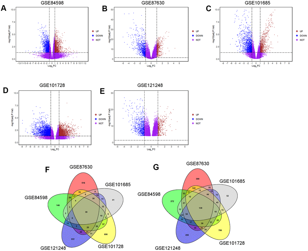 The DEGs in different microarray datasets were analyzed using GEO2R tool. In GSE84598, 1163 DEGs (up-regulation: 395 and down-regulation: 768) were screened between normal liver and HCC tissues (Figure 1A); in GSE87630, 1959 DEGs (up-regulation: 905 and down-regulation: 1054) were screened between normal liver and HCC tissues (Figure 1B); in GSE101685, 829 DEGs (up-regulation: 284 and down-regulation: 545) were screened between normal liver and HCC tissues (Figure 1C); in GSE101728, 2596 DEGs (up-regulation: 1172 up-regulated and down-regulation: 1424) were screened between normal liver and HCC tissues (Figure 1D); in GSE121248, 1545 DEGs (up-regulation: 663 and down-regulation: 882) were screened between normal liver and HCC tissues (Figure 1E). As shown in Figure 1F, 1G, 39 up-regulated and 138 down-regulated common DEGs among the five datasets were detected.