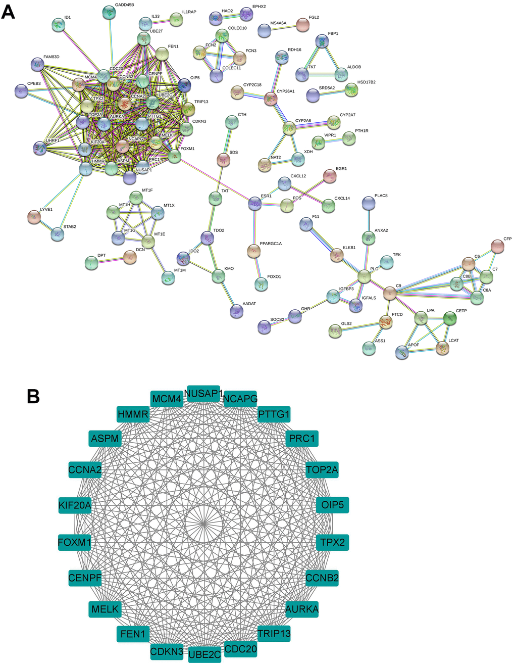 HCC represents a type of frequent human malignancy, and patients with advanced HCC had poor prognosis, though great improvements have been made in the HCC treatment [3]. Recently, the high-throughput technologies using microarray datasets have significantly promoted the discovery of novel targets associated with HCC pathophysiology [5]. Yet, more efforts should be investigated to reveal potential mechanisms underlying HCC progression. This study collected five microarray datasets associated with HCC, and identified a total of 177 common DEGs between normal liver and HCC tissues among these datasets. Further functional enrichment and constructed PPI network screened 22 hub genes from the common DEGs. The 22 hub genes were significantly up-regulated in HCC tissues. The survival analysis showed that 10 hub genes including AURKA, CCNA2, CDC20, FOXM1, HMMR, KIF20A, PTTG1, TOP2A, TPX2 and TRIP13 were correlated with poor prognosis of HCC patients. More importantly, functional studies demonstrated that KIF20A knockdown suppressed HCC cell proliferation and increased the HCC cell chemosensitivity to cisplatin and sorafenib. Collectively, these results indicated that these screened hub genes could potential serve as the key biomarkers for HCC.