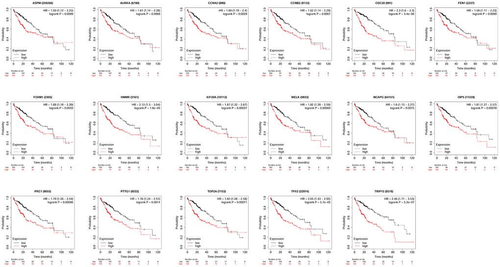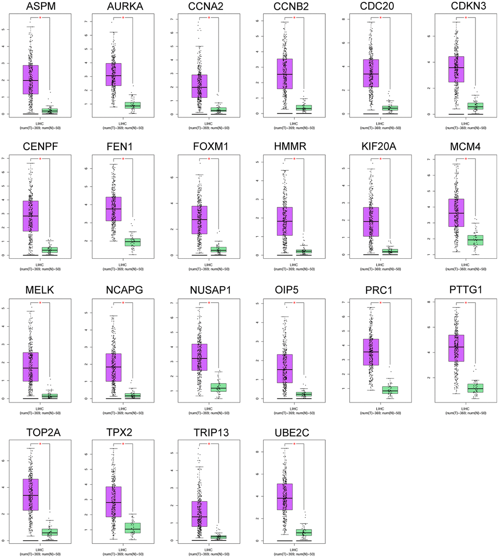 Expression levels of 22 hub genes were analyzed using GEPIA and UALCAN databases. The 22 hub genes (ASPM, AURKA, CCNA2, CCBN2, CDC20, CDKN3, CENPF, FEN1, FOXM1, HMMR, KIF20A, MCM4, MELK, NCAPG, NUSAP1, OIP5, PRC1, PTTG1, TOP2A, TPX2, TRIP13 and UBE2C) were up-regulated n HCC tissues comparing normal liver tissues (Figure 3). Consistently, mRNA expression of 22 hub genes was analyzed by using UALCAN databases, and the heatmap showed that these genes were up-regulated in HCC tissues (Supplementary Figure 2).