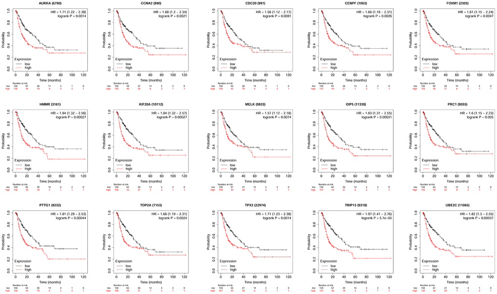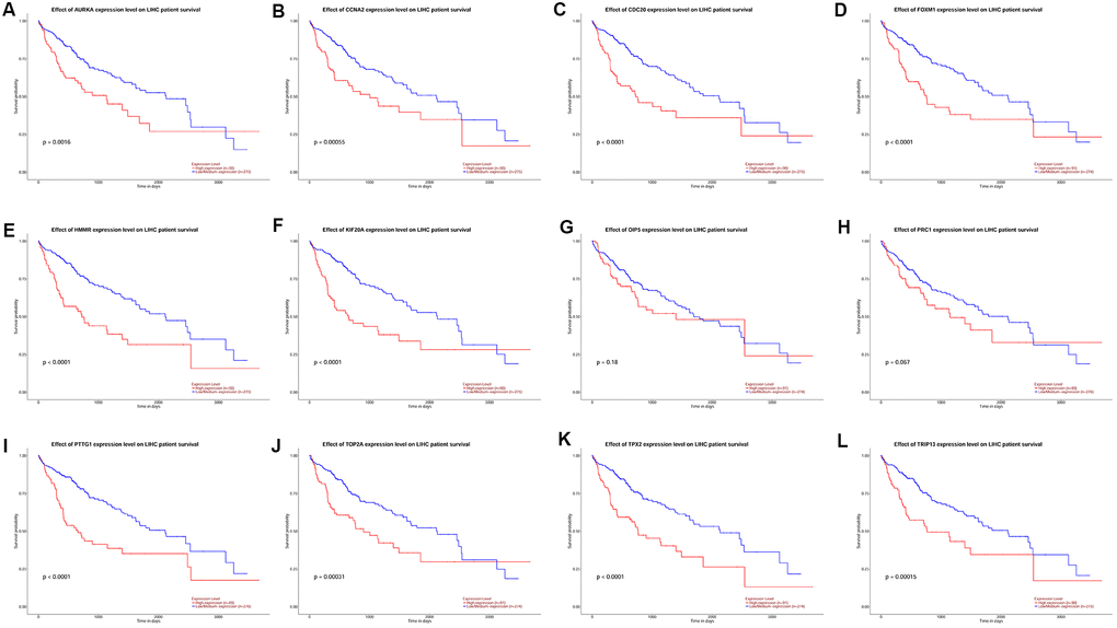 KM plotter database was used to perform survival analysis. Among the 22 hub genes, the up-regulated 17 genes (APSM, AURKA, CCNA2, CCNB2, CDC20, FEN1, FOXM1, HMMR, KIF20A, MELK, NCAPG, OIP5, PRC1, PTTG1, TOP2A, TPX2 and TRIP13) were correlated with the shorter OS of patients with HCC (Figure 4); while the other 5 hub genes were not correlated with the OS of patients with HCC. Furthermore, the 17 hub genes were subjected to disease-free survival (DFS) analysis using KM plotter, and the up-regulated 15 hub genes (AURKA, CCNA2, CDC20, CENPF, FOXM1, HMMR, KIF20A, MELK, OIP5, PRC1, PTTG1, TOP2A, TPX2, TRIP13 and UBE2C) were correlated with shorter DFS of HCC patients (Figure 5). Based on the above results, 12 hub genes (AURKA, CCNA2, CDC20, FOXM1, HMMR, KIF20A, OIP5, PRC1, PTTG1, TOP2A, TPX2 and TRIP13) predicting both poor overall survival and DFS of patients with HCC were further confirmed using UALCAN databases. As shown in Figure 6, the up-regulation of AURKA (Figure 6A), CCNA2 (Figure 6B), CDC20 (Figure 6C), FOXM1 (Figure 6D), HMMR (Figure 6E), KIF20A (Figure 6F), PTTG1 (Figure 6I), TOP2A (Figure 6J), TPX2 (Figure 6K) and TRIP13 (Figure 6L) was significantly correlated with shorter OS; while OIP5 (Figure 6G) and PRC1 (Figure 6H) were not correlated with the OS. Thus, 10 hub genes including AURKA, CCNA2, CDC20, FOXM1, HMMR, KIF20A, PTTG1, TOP2A, TPX2 and TRIP13 may predict poor prognosis of the patient with HCC.