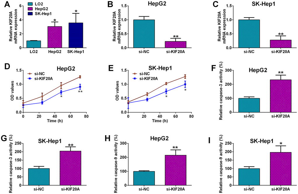 Among these genes, KIF20A has not been fully explored, thus, role of KIF20A in the HCC pathophysiology was further explored. KIF20A expression was remarkably up-regulated in the HCC cell lines i.e. HepG2 and SK-Hep1 when compared to normal liver cell line i.e. LO2 (Figure 7A). Furthermore, the in vitro functions of KIF20A in HCC cells were evaluated by the loss-of-function studies. The knockdown of KIF20A in both HepG2 and SK-Hep1 cells was achieved by transfecting these cells with KIF20A; the transfection of KIF20A siRNA significantly decreased the mRNA expression level of KIF20A in HepG2 and SK-Hep1 cells (Figure 7B, 7C). The MTS proliferation assay revealed that silence of KIF20A significantly attenuated the proliferative capacities of both HepG2 and SK-Hep1 cells as compared to the si-NC group (Figure 7D, 7E). Caspase-3 and -9 activity kits were used to measure caspase-3 and -9 activities in HCC cells, respectively. As shown in Figure 7F and 7G, KIF20A knockdown significantly increased the caspase-3 activities in both HepG2 and SK-Hep1 cells (Figure 7F, 7G); and consistent findings for caspase-9 were also detected in the HCC cells with KIF20A siRNA transfection (Figure 7H, 7I).