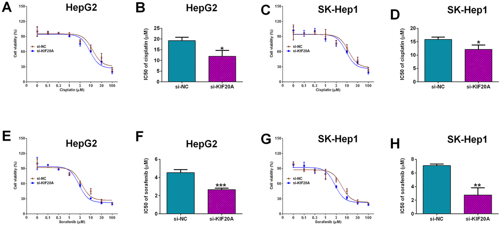 Furthermore, the effects of KIF20A knockdown on the cisplatin-resistance and sorafenib-resistance were analyzed in HepG2 and SK-Hep1 cells. Knockdown of KIF20A significantly increased the chemo-sensitivity to cisplatin in HepG2 cells when compared to si-NC group with the si-KIF20A group exhibiting decreased IC50 values of cisplatin (Figure 8A, 8B); consistent findings were also found in SK-Hep1 cells (Figure 8C, 8D). More importantly, knockdown of KIF20A significantly decreased the IC50 values of sorafenib in both HepG2 (Figure 8E, 8F) and SK-Hep1 cells (Figure 8G, 8H) when compared to si-NC group, suggesting the KIF20A increased the chemo-sensitivity to sorafenib in HCC cell lines.