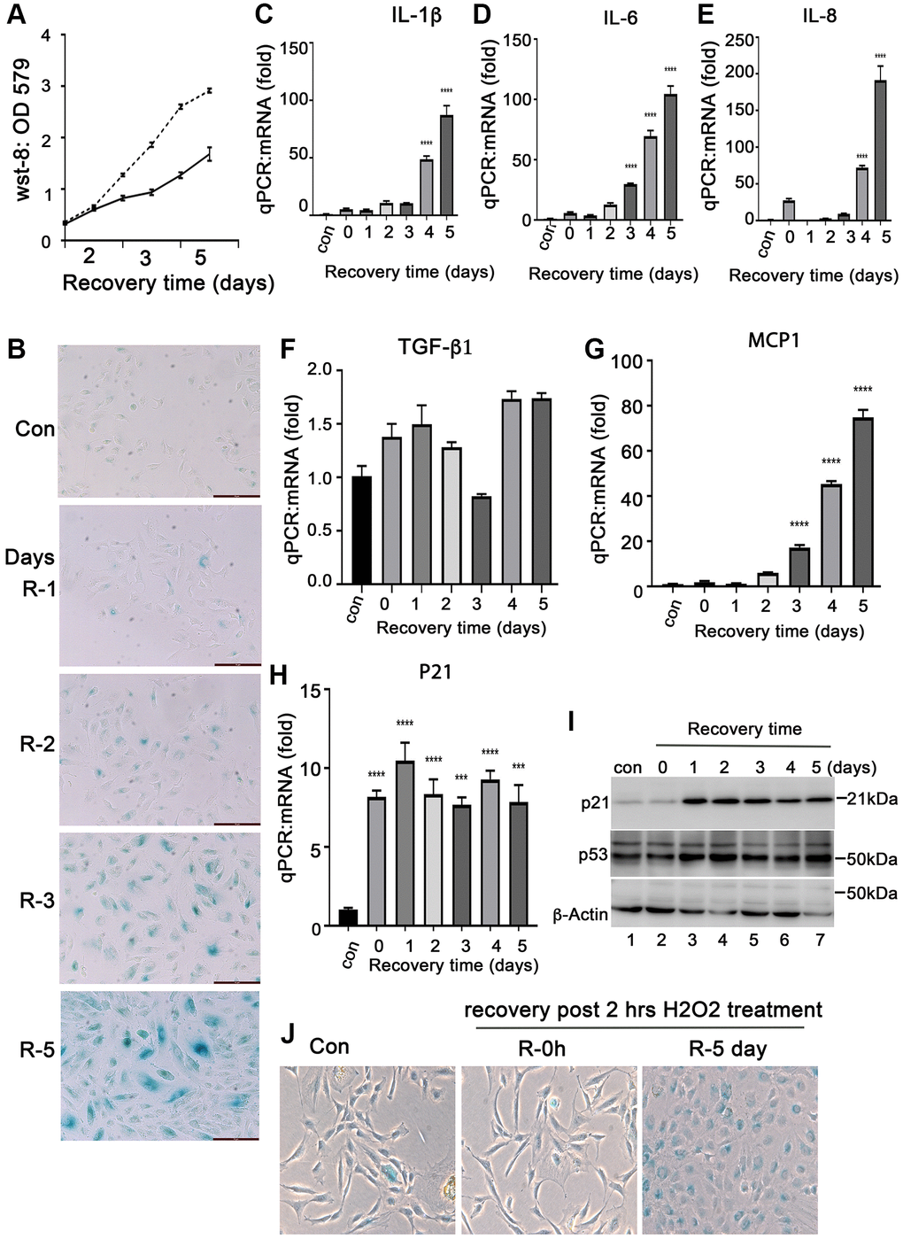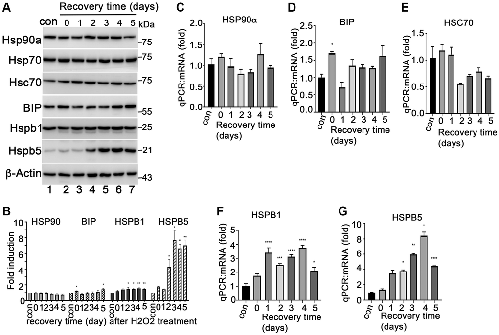 Senescent RPE cells is closely associated with AMD development. Oxidative stress is a common factor causing RPE cell senescence. To study the characteristics of senescent RPE cells, we established a model of senescent RPE cells by treating ARPE-19 cells with H2O2in vitro. The ARPE-19 cells were treated with H2O2 at 50, 200, 350 and 500 μM for 2 hours followed by recovery for 72 hours in normal media. We found that 200–300 μM of H2O2 are proper doses to induce ARPE-19 cells to undergo senescence (Supplementary Figure 1). The increase H2O2 caused ARPE-19 cell death (data not shown). Compared to normal ARPE-19 cells, the short term treatment with 200 μM of H2O2 attenuated ARPE-19 cells growth (Figure 1A), and the cells continued to survive at least for 10 days after treatment (data not shown). We examined the senescent biomarkers of these cells. SA-β-Gal positive cells were detectable in day 2 after H202 treatment, and the number of positive cells continued to increase with prolonged recovery time after treatment (Figure 1B) with the increases of the expression of senescence-associated cytokines, such as IL-1β, IL-6, IL-8, MCP-1, but not TGF-β1 (Figure 1C–1G) and other senescence markers, such as P21 and P53 at both mRNA and protein levels (Figure 1H and 1I). P16INK4 was not detected at both mRNA and protein levels (data not shown), and the reason for this is still under investigation. Interestingly, we found that the expression of anti-apoptotic proteins such as Bcl-xL (Supplementary Figure 2A and 2B), c-Flip (Supplementary Figure 2C) and aB-crystallin (Figure 2G) were induced in the ARPE-19 cells that underwent senescence, which may explain the ability of senescent RPE to survive. In addition, we also examined this H2O2-induced senescence model on monkey primary RPE cells. We treated the primary monkey RPE cells at passage 3 with 250 μM H2O2 for 2 hours followed by recovery for 0 and 4 days in complete media. Most of day-4 recovery cells were SA-β-Gal positive compared to the cells cultured in control conditions or in H2O2-treated cells without recovery (Figure 1J). Taken together, these results indicated that treatment of H2O2 at a concentration of 200 uM–300 uM for 2 hours could induce RPE cells to undergo cellular senescence in vitro. Most RPE cells undergo senescence at day 3 recovery post- H2O2 treatment. These senescent cells could survive for a period of time.