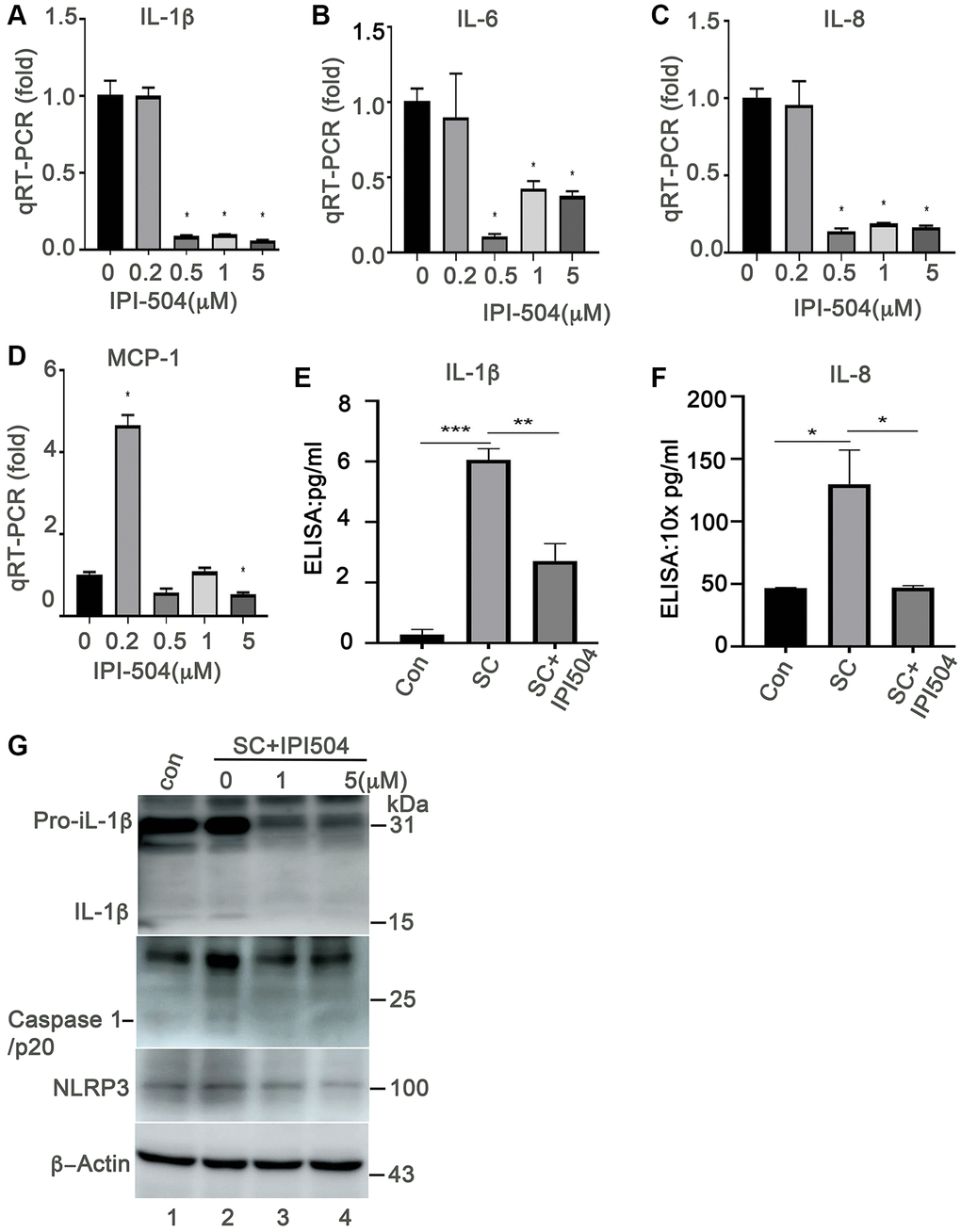 HSP90 plays multiple functions in orchestrating the proteostasis of cells under different conditions. Inhibition of HSP90 reduces the expression of senescence-associated inflammatory factors in senescent cancer cells [36] and extends the lifespan of Ercc1-defficient progeroid mice by inducing senescence cell apoptosis [28]. These results revealed the HSP90 might act as a novel senotherapeutic target. We tested the expression profile of heat shock proteins, including HSP90, in the H2O2-induced senescent ARPE-19 cells. The results showed that HSP90 was abundantly and constantly expressed at both mRNA and protein levels in control and senescent ARPE-19 cells with no difference between the treatment groups (Figure 2A–2C). ER stress-associated BIP and small heat shock proteins (e.g., Hsp25 and αB-crystallin) were upregulated in the H2O2 induced senescent cells compared to that in normal ARPE-19 cells (Figure 2A, 2D, 2F and 2G). However, Hsc70 and HSP70 were not changed in senescent cells (Figure 2A and 2E). The results suggested that heat shock proteins were reprogrammed during senescence of RPE cells. To determine, whether HSP90 is essential for senescent RPE cell homeostasis, we further treated senescent ARPE-19 cells with IPI-504, an inhibitor of HSP90 that binds to and inactivates HSP90’s ATPase activity. IPI-504 exhibited more cytotoxicity to the proliferative ARPE-19 cells (IC50 = 6.16 μM, R2 = 0.93) than to the senescent ARPE-19 cells (IC50 = 36.78 μM; R2 = 0.99) (Supplementary Figure 3) in vitro. We treated day-4 senescent ARPE-19 cells with IPI-504 at concentrations of 0, 0.2, 0.5, 1 and 5 μM for 24 h. No apoptosis was observed in the senescent ARPE-19 cells treated with IPI-504 at those concentrations (Supplementary Figure 2B and data not shown). We further measured the expression of senescence-associated inflammatory factors with qPCR. As the results indicated in Figure 3, IPI-504 inhibited the mRNA expression of IL-1β, IL-6, IL-8, and MCP-1 in a dose dependent manner (Figure 3A–3D), and the tested pre-IL-1β protein expression (Figure 3G). As expected, the results of the ELISA indicated that IPI-504 also reduced the amount of IL-1β and IL-8 proteins in the supernatants of senescent ARPE-19 cells (Figure 3E and 3F). Hsp90 was reported to regulates IL-1β secretion by associating with inflammasome including NLRP3 and caspase 1 [35]. The data in Figure 3G showed that the pre-IL-β and NLRP3 proteins were upregulated in senescent ARPE-19 cells compared to normal ARPE-19 cells (Figure 3G lanes 1 and 2). IPI-504 reduced the expression of NLRP3 protein, cleaved caspase 1 and matured IL-1β in senescent ARPE-19 cells (Figure 3G, lanes 2–4). Therefore, these results suggested IPI-504 inhibited not only pre-IL-1β protein expression but also its maturation for secretion.