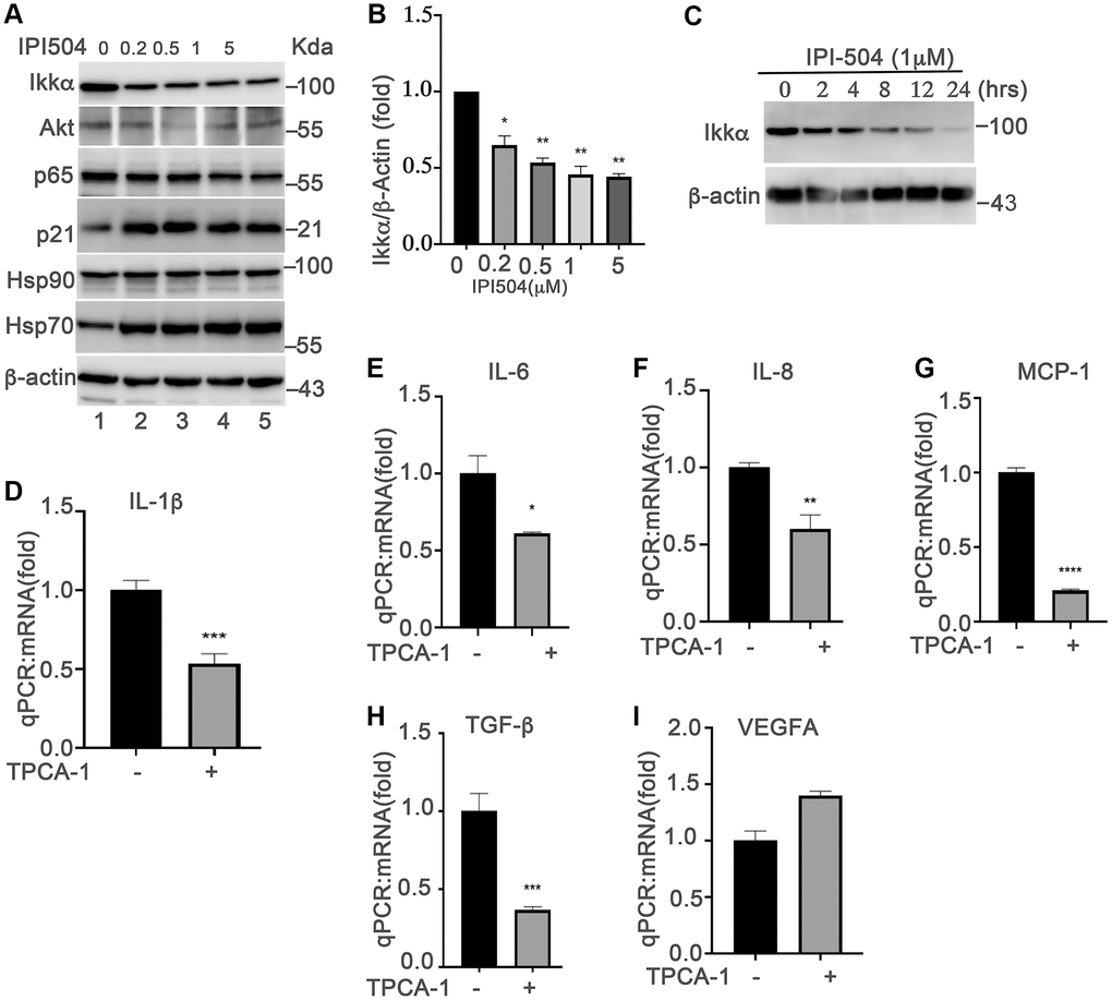 Upregulation of SASPs is a fundamental mechanism of senescent cells that is responsible for aging and aging-associated diseases. NF-κB pathway is the predominant regulator of cytokines in senescent cells [19]. The senescence-inducers (e.g., ROS) activate the IKKα/ IKKβ complex to phosphorylate and induce the degradation of iκB, which results in the translocation of P65 into the nucleus to upregulate the expression of cytokines. Inhibition of HSP90 by geldanamycin induces IKKα and IKKβ degradation, and inhibits the constitutive and inducible NF-κB activity [37]. Thus, we postulated that HSP90 regulates the SASPs in senescent ARPE-19 cells by associating with NF-κB pathways. To test this hypothesis, we treated day-4 senescent ARPE-19 cells with IPI-504 at the indicated concentrations (Figure 4A). The results showed that IPI-504 reduced the protein levels of IKKα and AKT in a dose- and time-dependent manner (Figure 4A–4C, and Supplementary Figure 5A, lane 2), and this reduction of IKKα was restored by lysosomal inhibitor chloroquine but not by MG132 (Supplementary Figure 5A, lane 3), suggesting that IPI-504 induced IKKα protein degradation occurred in the lysosome, which is consistent with a previous report [38]. As a consequence, IPI-504 induced iκB protein expression (Supplementary Figure 5A, lane 2), and inhibited p65 nuclear translation (Supplementary Figure 5B). These results suggested that IPI-504 inhibited NF-κB pathway activities in senescent RPE cells. To confirm whether the NF-κB pathway regulates the SASP phenotype in senescent ARPE-19 cells, we treated day-4 senescent ARPE-19 cells with TPCA-1, an inhibitor of IKK1β and IKK1α. TPCA-1 inhibited the expression of IL-1β, IL-6, IL-8 and MCP-1, but not VEGFA in senescent ARPE-19 cells (Figure 4D–4I) as well as in replicative senescent monkey RPE cells (Supplementary Figure 5C). Taken together, these results indicated that the NF-κB pathway was activated for the expression of IL-1β, IL-6, IL-8 and MCP-1 during senescence in ARPE-19 cells, and the activities of the NF-κB pathway was regulated by HSP90 chaperone activity.
