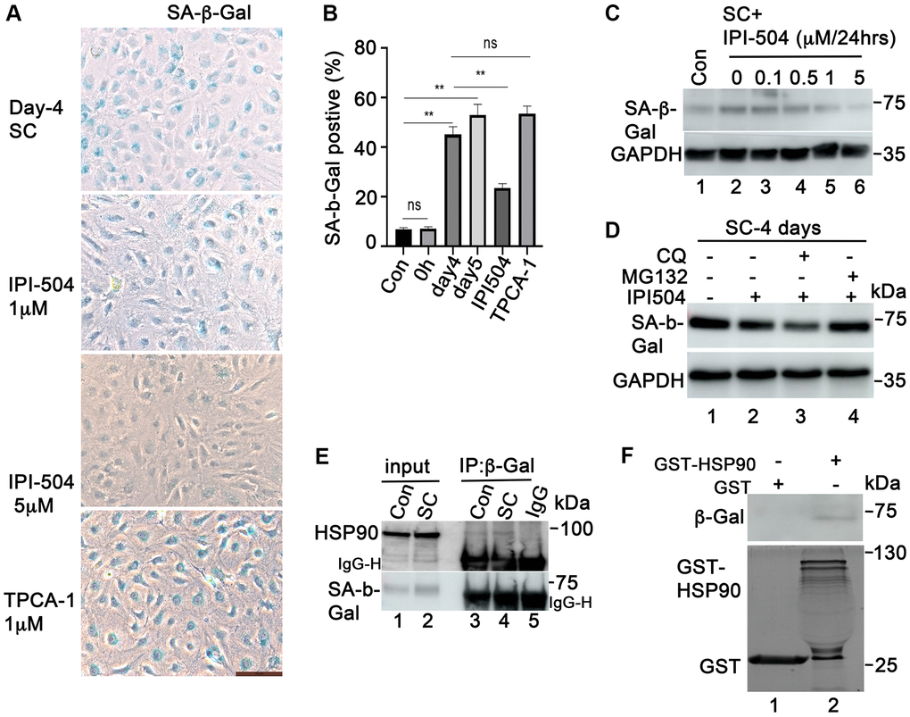 SA-β-Gal is a lysosomal enzyme that hydrolyzes β-galactosidase into monosaccharides in senescent cells and in some post mitotic cells [39]. Its activity is correlated with its expression level in senescent cells [40]. We further studied the expression of SA-β-Gal in the cells that were treated with IPI-504. The results showed that SA-β-Gal protein was upregulated in day-4 senescent ARPE-19 cells compared to that in normal ARPE-19 cells (Figure 5C, lanes 1 and 2). IPI-504 decreased SA-β-Gal protein levels in a dose-dependent manner in day-4 senescent ARPE-19 cells (Figure 5C, lanes 2–6) without affecting SA-β-Gal mRNA levels (Supplementary Figure 6B). The reduction of SA-β-Gal by IPI-504 was restored by proteasome inhibitor MG132, but not by lysosome inhibitor chloroquine (Figure 5D). The decrease in SA-β-Gal protein level was also observed in IPI-504-treated HeLa cells (Supplementary Figure 6C). These results indicated that HSP90 is involved in regulating SA-β-Gal protein stabilization. We further tested the protein-association between HSP90 and SA-β-Gal using GST-pull down and immunoprecipitation assays. HSP90 coimmunoprecipited with SA-β-Gal in both proliferating and senescent ARPE-19 cells (Figure 5E). The GST-pull down results showed that SA-β-Gal proteins in senescent ARPE-19 cells co-precipitated with bacterially purified GST-HSP90 proteins but not with GST protein alone (Figure 5F, lanes 2 and 1). The GST and GST-HSP90 proteins used for pull down assay were stained in coomassie blue (Figure 5F, low panel) Taken together, these results suggested that HSP90 interacted with and regulated β-galactosidase protein stability in senescent RPE cells.