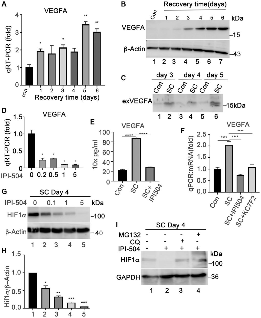 HIF1α is a transcription factor that regulates VEGFA transcription under hypoxia or oxidative stress conditions. HIF1α is a client protein of HSP90. Thus, we postulated that the inhibition of VEGFA expression by IPI-504 was mediated through HIF1α. As expected, IPI-504 did not impact HIF1α mRNA expression (Supplementary Figure 7A), but it inhibited HIF1α protein expression in a dose dependent manner in day-4 senescent ARPE-19 cells (Figure 6G and 6H). The reduction of HIF1α by IPI-504 was restored by both lysosomal inhibitor chloroquine and proteasomal inhibitor MG132 (Figure 6I). These results suggested that HSP90 modulated HIF1α protein stability in senescent RPE cells. To determine whether HIF1α is responsible for VEGFA expression, we treated senescent RPE cells with the HIF1α inhibitor KC7F2, a chemical that inhibits HIF1α protein synthesis [42]. Like IPI-504, KC7F2, which inhibits protein synthesis of HIF1α (Supplementary Figure 7B), significantly inhibited VEGFA mRNA expression in day 4 senescent ARPE-19 cells (Figure 6F). These results suggested that IPI-504 inhibited VEGFA expression in senescent ARPE-19 cells by decreasing HIF1α protein stability.