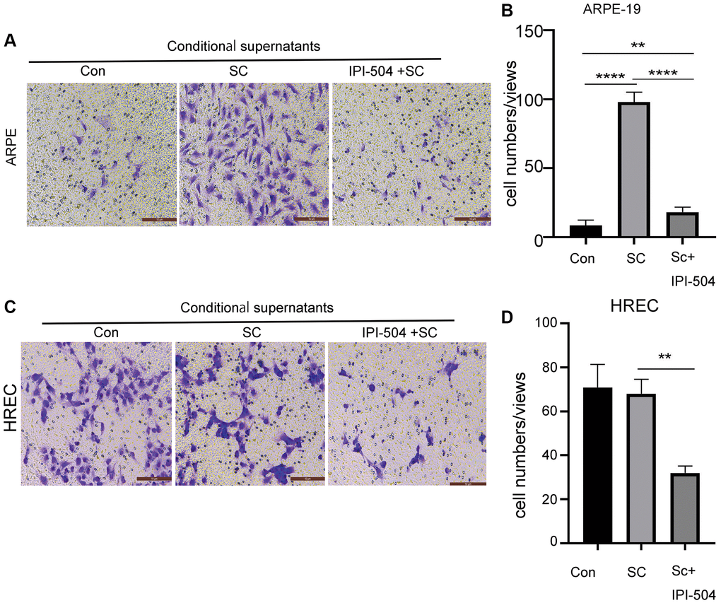 Senescent RPE cells associate with its neighbor or distant cells via SASP. One of SASP function is to regulate cell migration. Because IPI-504 inhibits the SASP in senescent RPE cells, we postulated that IPI-504 suppressed senescent ARPE-mediated cell migration. To this end, day-4 senescent ARPE-19 cells were treated with media containing IPI504 or PBS (sham) for 24 hours respectively. After this, the cells were washed with PBS and continually cultured in serum-free media for 24 hours. The supernatants were collected as conditional supernatants to incubate ARPE-19 cells and HREC (human retinal endothelial cells) cells for migration test. The results indicated that the supernatants of senescent ARPE-19 cells increased migration of ARPE-19 but not HREC cells compared to the supernatants from normal ARPE-19 culture (Figure 7). The supernatants of IPI-504-pretreated senescent ARPE-19 cells significantly attenuated the migration of ARPE cells and HREC cells compared to the supernatants of senescent ARPE-19 cells (Figure 7A–7D, and Supplementary Figure 8). Taken together, these results suggested that IPI-504 could attenuate the senescent ARPE-19 cell’s communication with its neighboring or distant cells.