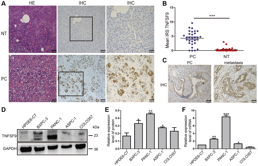 In our previous article, we found that TNFSF9 is positively correlated with the poor prognosis of PC [6]. Therefore, we analyzed the expression of TNFSF9 in PC and normal tissues adjacent to cancer, and found that the expression of TNFSF9 in PC was significantly higher than that in normal tissues adjacent to cancer (P < 0.001) (Figure 1A, 1B). Moreover, we found that the expression of TNFSF9 in PC tissues with metastasis was significantly higher than that in PC tissues without metastasis (Figure 1C). In addition, at the mRNA and protein levels, the expression of TNFSF9 in pancreatic cancer cells ASPC-1, PANC-1 and BXPC-3 was significantly higher than that of normal pancreatic epithelial cells HPDE6-C7 (P < 0.05), while the expression of COLO357 was not different from HPDE6-C7 (Figure 1D–1F). These results indicated that the expression of TNFSF9 in PC is significantly increased, and may be related to the metastasis of PC.