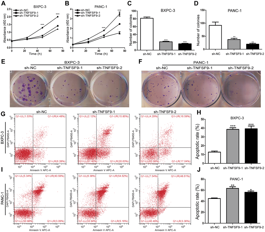In addition, we also used flow cytometry to analyze the effect of TNFSF9 knockdown on the apoptosis of PC cells, and found that whether it is in BXPC-3 cells or PANC-1 cells, sh-TNFSF9-1 and sh-TNFSF9 -2 compared with the sh-NC group, its apoptosis was significantly increased (P < 0.05) (Figure 2G–2J). These results indicated that TNFSF9 can promote the proliferation of PC cells and inhibit the apoptosis of PC cells.