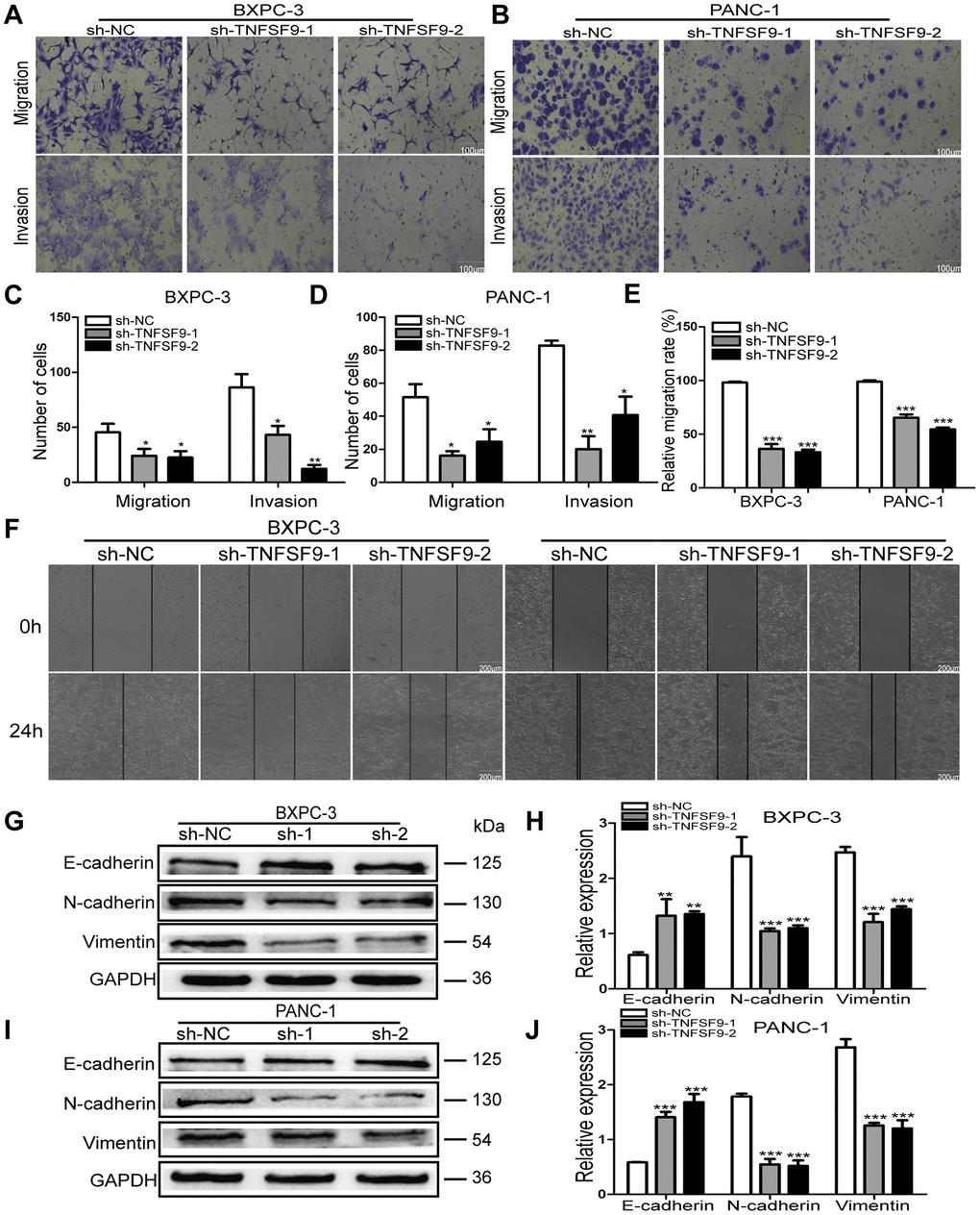 We used transwell experiments to analyze the effect of TNFSF9 knockdown on the migration and invasion of BXPC-3 and PANC-1 cells. We found that after knocking down TNFSF9, the number of migration and invasion of BXPC-3 and PANC-1 cells was significantly reduced compared with the sh-NC group (P < 0.05) (Figure 3A–3D). The scratch test also showed that the migration rate of BXPC-3 and PANC-1 cells in the sh-TNFSF9-1 and sh-TNFSF9-2 groups was significantly reduced compared with the sh-NC group (P < 0.001) (Figure 3E, 3F). In addition, we analyzed the expression of epithelial-mesenchymal transition (EMT)-related proteins using western blot experiments. We found that the expression of E-cadherin in the sh-TNFSF9-1 and sh-TNFSF9-2 groups was significantly higher than that in the sh-NC group, while the expressions of N-cadherin and Vimentin were significantly lower than those in the sh-NC group (P < 0.01) (Figure 3G–3J). It shown that TNFSF9 may promote the metastasis of pancreatic cancer by regulating the EMT process.