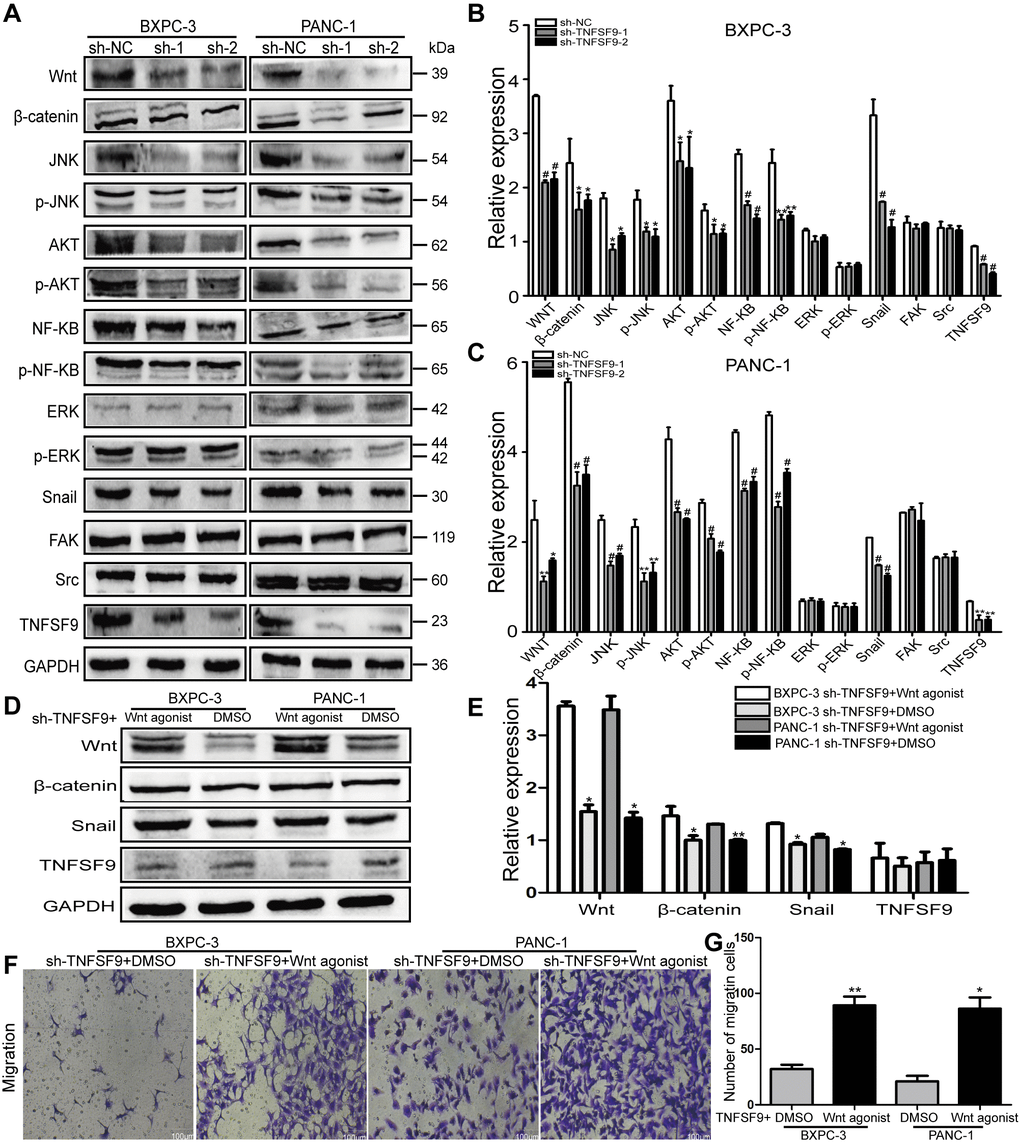 Furthermore, we added Wnt agonist to TNFSF9 knockdown pancreatic cancer cells, and found that compared with the sh-TNFSF9 + DMSO group, the expressions of Wnt, β-catenin and Snail were increased in the sh-TNFSF9 + Wnt agonist group (P < 0.05), while the expression of TNFSF9 was not different (Figure 4D, 4E). In addition, compared with the sh-TNFSF9 + DMSO group, the migration of pancreatic cancer cells in the sh-TNFSF9 + Wnt agonist group was significantly increased (P < 0.05) (Figure 4F, 4G). In conclusion, TNFSF9 may promote the metastasis of pancreatic cancer by activating its downstream Wnt/Snail signal.