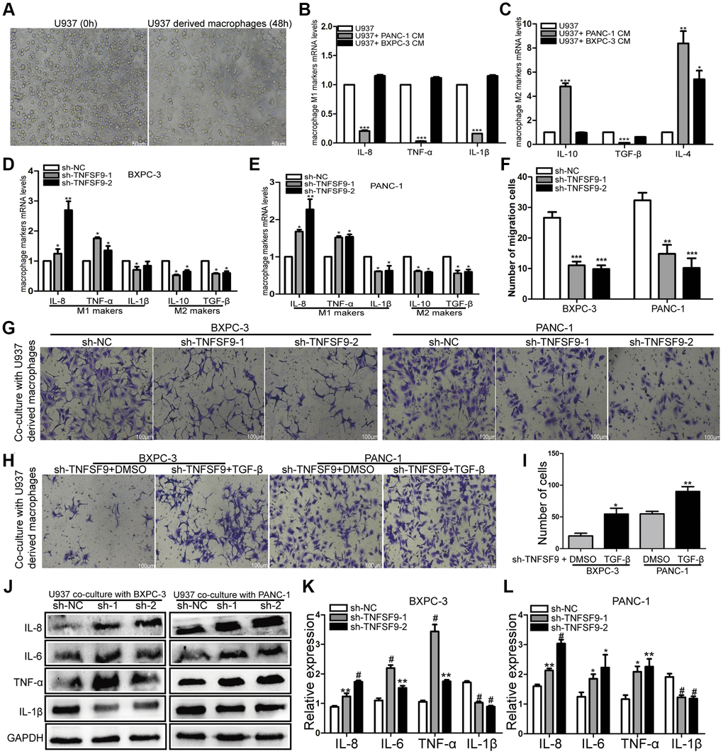 Crosstalk between tumor cells and immune cells can affect tumor metastasis. Therefore, we induced U937 cells into macrophages to analyze the effects of pancreatic cancer cells on macrophages (Figure 5A). We first co-cultured wild-type pancreatic cancer cells with U937-derived macrophages, and found that compared with U937-derived macrophages, mRNA levels of M1-type markers (IL-8, TNF-α and IL-1β) in U937-derived macrophages were significantly decreased after co-cultured with PANC-1 cells (P < 0.001) (Figure 5B). The mRNA levels of M2 markers (IL-10, TGF-β and IL-4) were significantly increased (P < 0.01) (Figure 5C). BXPC-3 cells only up-regulated IL-4 mRNA levels (P < 0.05) (Figure 5C). And then, we co-cultured TNFSF9-knockdown pancreatic cancer cells with U937-derived macrophages and found that compared with the sh-NC group, the mRNA levels of M1-type markers (TNF-α and IL-8) in sh-TNFSF9-1 and sh -TNFSF9-2 groups were increased and the mRNA levels of IL-1β were decreased. MRNA levels of M2-type markers (IL-10 and TGF-β) were decreased (P < 0.05) (Figure 5D, 5E). These results suggested that TNFSF9 expression on PC cells can promote M2 polarization of macrophages.