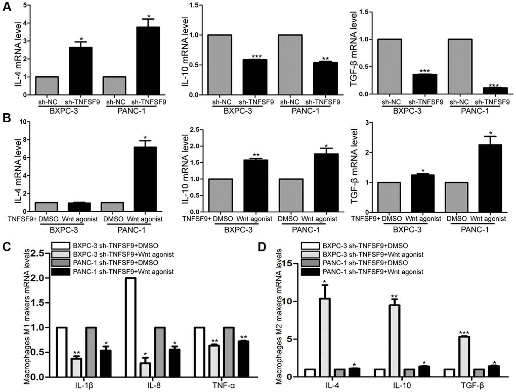 Next, we co-cultured TNFSF9 knockdown pancreatic cancer cells supplemented with Wnt agonist with macrophages, and found that the mRNA levels of M1 macrophage markers (IL-1β, IL-8 and TNF-α) were significantly decreased (P < 0.05) (Figure 6C), and M2 markers (IL-4, IL-10 and TGF-β) were significantly increased (P < 0.05) (Figure 6D). In summary, TNFSF9 promotes the release of IL-10 and TGF-β from pancreatic cancer cells by activating Wnt signaling, thereby promoting M2 polarization of macrophages.