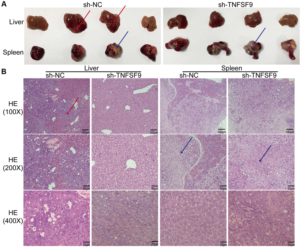 In order to study the effect of TNFSF9 on PC metastasis in vivo, we injected TNFSF9 knockdown PANC-1 cells into the spleen of nude mice to construct a metastasis model. We found that all nude mice in the sh-NC group had obvious liver metastasis, with a metastasis rate of 100%, which was manifested as gray-yellow lesions of different sizes on the surface of the liver, which were dispersed and partially fused into blocks. No normal spleen tissue was found, and all were tumor tissues (Figure 7A). Two of the 7 nude mice in the sh-TNFSF9 knockdown group had liver metastases, the metastasis rate was 28.6%, and the metastasis was significantly less than that in the sh-NC group. Normal spleen tissue is still visible (Figure 7A). We sliced liver and spleen tissues and performed HE staining to confirm the results (Figure 7B).