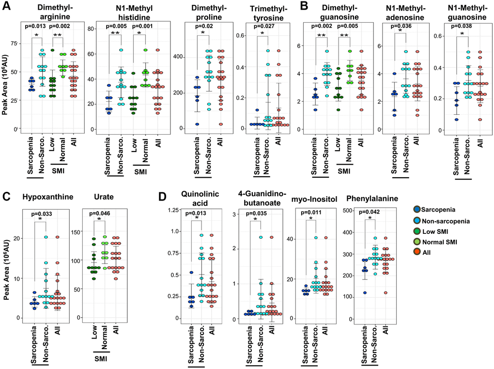 All metabolomic profiles in these participants were previously analyzed by LC-MS [28]. The 131 metabolites detected were confirmed using standard compounds or by MS/MS, as previously reported [28]. We performed a comprehensive assessment of 131 metabolites based on the diagnosis of sarcopenia (Supplementary Data 1). We identified 22 compounds as sarcopenic markers (Supplementary Table 2), which did not overlap with 15 frailty markers in the same dataset [28]. Among these 22 compounds, 21 metabolites (acetyl-carnitine, dimethyl-proline, phenylalanine, dimethyl-arginine, N1-methyl-histidine, isovaleryl-carnitine, myo-inositol, creatinine, pantothenate, hypoxanthine, dimethyl-guanosine, N1-methyl-adenosine, 2-oxoglutarate, pentose-phosphate, succinate, N-acetyl-glutamate, quinolinic acid, 4-guanidinobutanoate, N1-methyl-guanosine, trimethyl-tyrosine, and cis-aconitate) decrease significantly in sarcopenia, while aspartate increases. In addition, comparisons between low- and normal-SMI groups identified 10 SMI markers: urate, butyro-betaine, dimethyl-arginine, N1-methyl-histidine, isovaleryl-carnitine, creatinine, hippurate, dimethyl-guanosine, 2-oxoglutarate, and cis-aconitate (Supplementary Table 3). All 10 SMI markers are significantly decreased in the low-SMI group. Thirteen of 22 sarcopenia markers and all 10 SMI markers are significantly correlated with SMI (Supplementary Table 4). As three SMI markers (urate, butyro-betaine, and hippurate) did not overlap with sarcopenia markers, a total of 25 metabolites are identified as sarcopenia-related markers.