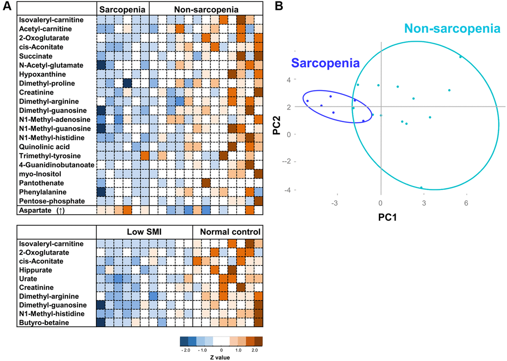 Finally, we addressed the question of whether these sarcopenia-related metabolites are useful for detection of sarcopenia. As we noticed that 22 sarcopenia markers are distinct from 15 previously reported frailty markers (Figure 4) [28], we assessed the correlation analysis between 25 sarcopenia-related metabolites and Edmonton frail scale (EFS), and that between 22 frailty-related markers and SMI. Three sarcopenia-related markers (isovaleryl-carnitine, hippurate, and urate) were significantly correlated with EFS (Supplementary Table 4), while eight frailty-related markers (acetyl-carnosine, urate, 1,5-anhydroglucitol, proline, methionine, leucine, isovaleryl-carnitine, hippurate) were significantly correlated with SMI (Supplementary Table 5). These results suggest that sarcopenia-related or frailty metabolites partly correlate with the diagnostic parameters for frailty (EFS) or sarcopenia (SMI), respectively. However, heatmap analysis and principal component analysis (PCA) using sarcopenia-related metabolites indicated much closer interrelation between sarcopenia and sarcopenia-related metabolites. Heatmap comparisons of 22 sarcopenia markers revealed their distinct distributions in sarcopenic and non-sarcopenic persons (Figure 4A upper panel). Similar results were observed regarding 10 SMI markers among low-SMI and control groups (Figure 4A lower panel). Next, we applied PCA, based on 22 sarcopenia markers. PCA distinguished sarcopenia patients from non-sarcopenia controls (Figure 4B). However, PCA with sarcopenia markers did not distinguish the frail population from non-frail controls (Supplementary Figure 3B).