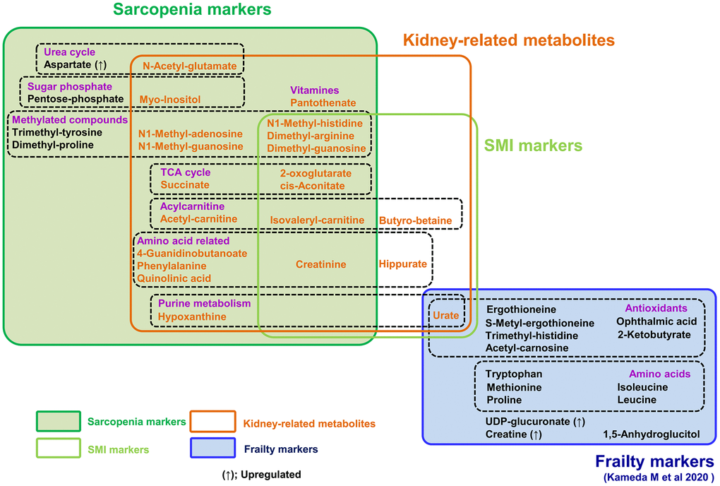 Here previous metabolomic data from the study of frailty diagnosed using the EFS are analyzed, based on sarcopenic diagnoses in the same group [28]. In sharp contrast to the 15 frailty markers, including antioxidants, we identified 22 sarcopenia markers, comprising TCA cycle compounds, urea cycle compounds, muscle or nitrogen metabolites, and methylated metabolites. Interestingly, most metabolites that decreased in sarcopenia or low SMI are uremic compounds that increase as a result of kidney impairment. Thus, metabolite profiles in sarcopenia are largely distinct from those of frailty.