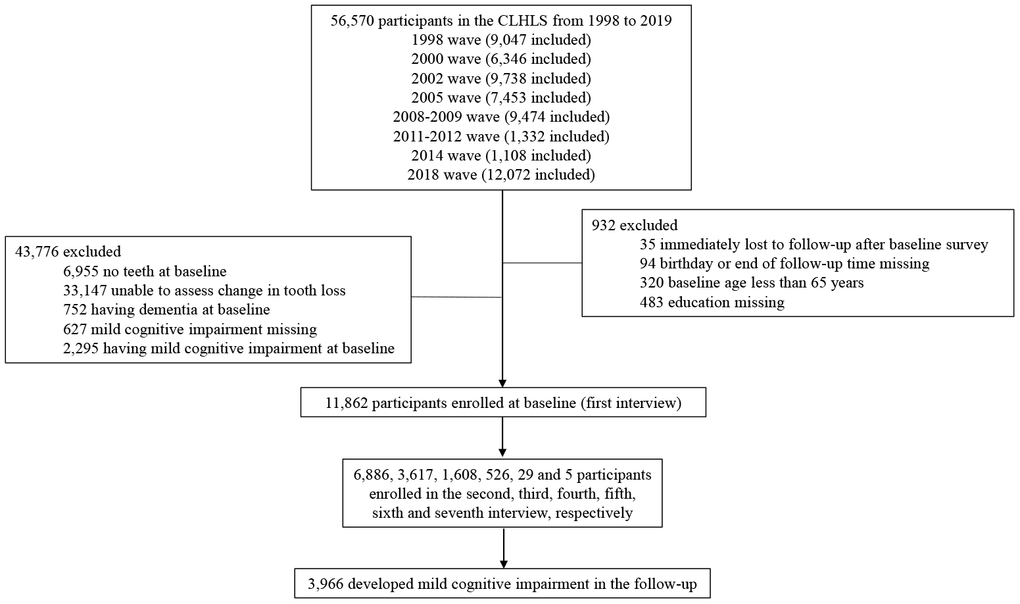 The Chinese Longitudinal Healthy Longevity Survey (CLHLS) is an ongoing longitudinal study of the elderly adults [35]. It started in 1998, and a series of follow-up surveys was conducted in 2000, 2002, 2005, 2008-2009, 2011-2012, 2014, and 2018-2019, respectively. In order to well-represent elderly adults in China and maintain enough sample size, new participants were added to the survey in the follow-up waves. We enrolled all participants (1998 wave), survivors and new participants (consequent waves) in the present study (n=56,570), and over 74% participants were firstly interviewed before 2011-2012 wave (Figure 1). Participants with the following reasons were excluded from the analysis: (1) immediately lost to follow up after baseline survey (n = 35); (2) birthday or end of follow up time missing (n = 94); (3) baseline age less than 65 years (n = 320); (4) education missing (n = 483); (5) no teeth at baseline (n = 6,955); (6) unable to assess change in teeth loss (n = 33,147); (7) having dementia at baseline (n = 752); (8) MCI missing (n = 627); or (9) having MCI at baseline (n = 2,295). Eventually, a total of 11,862 participants were enrolled in the final analysis. Among them, 6,886, 3,617, 1,608, 526, 29 and 5 participants had two, three, four, five, six and seven times of interview (Figure 1). Research Ethics Committees of Peking University approved the CLHLS, and written informed consents from all participants or their representatives were collected.