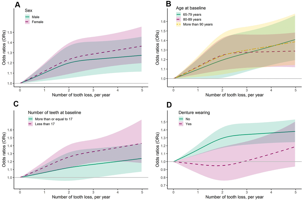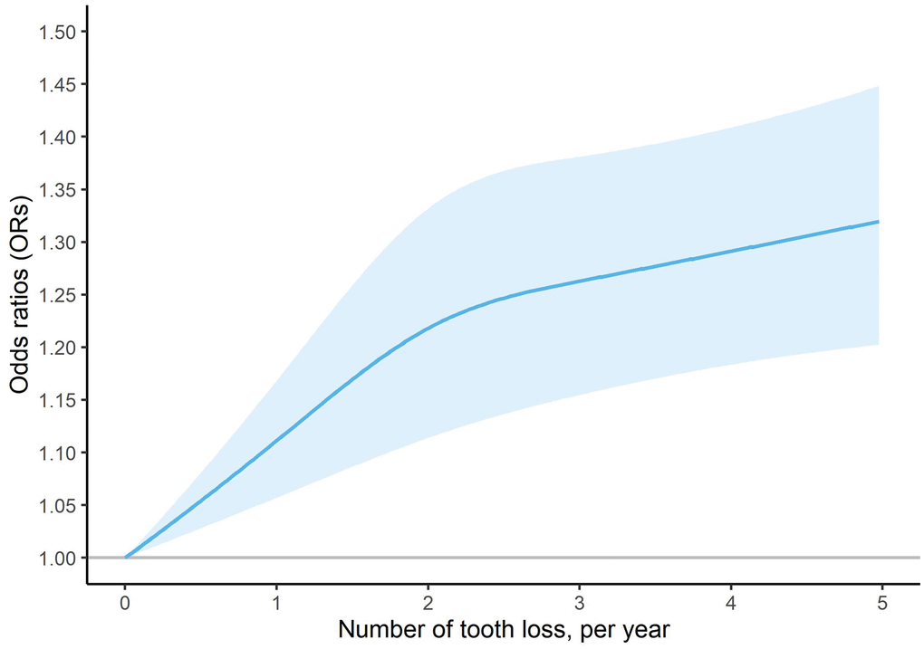 To further explore the dose-response association between number of tooth loss per year and risk of MCI in the whole and subgroup population, restricted cubic spline function with 3 knots selected at number of tooth loss per year of “1, 2, 3” was applied in the GEE model. The reference value for number of tooth loss per year was zero.
