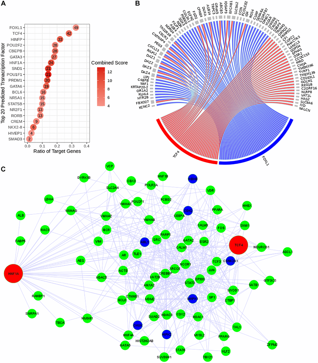 The regulatory network system upstream to the expression of the discriminating genes (with positive regression coefficients) was reconstructed using Expression2Kinase tool. This prediction tool allows us to identify in Figure 3A the top 20 predicted transcription factors (TFs) that can regulate the expression of the genes detected in this study (Figure 3A). The circos diagram in Figure 3B represents the relationship between the top 2 TFs that target the largest number of genes identified in our study (49 and 42 genes for FOXL1 and TCF4 respectively). We then analyzed the subnetworks of regulation and observed a common regulatory network pattern associated with TCF4 and HNF1A that was identified as a PPR (estimated coefficient β = 22.87; p-value = 0.007). The regulatory network in Figure 3C presents these TFs (red nodes); (ii) the intermediate proteins likely to be involved in the formation of a regulatory complex with these TFs (green nodes) and (iii) the kinases that are expected to be the activators of the regulatory complexes (dark blue nodes). This predicted regulatory network connects HNF1A and TCF4 and suggests a possibility of a co-regulatory system involving both TFs (Figure 3C).