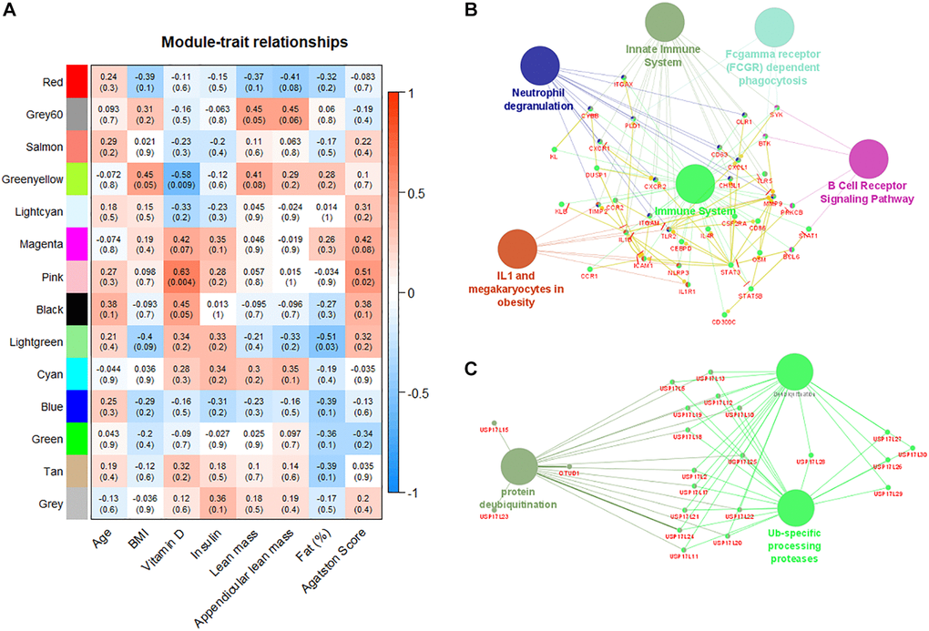 Moreover, we identified by weighted gene co-expression network analysis gene modules correlated with patients’ relevant clinical and laboratory characteristics. This approach is complementary to the classical differential expression analysis and have the advantage to associate gene expression profiles with patients data, improving the interpretability of the finding [25, 26]. The weighted gene co-expression analysis identified 14 correlated modules (Figure 4A). A gene module involving immune system alterations was positively correlated with serum levels of vitamin D (r = 0.63, p-value = 0.004) and Agatston score (r = 0.51, p-value = 0.02). Epidemiological studies have shown that a poor vitamin D status is associated with an increased risk of several diseases, including autoimmune diseases [27]. Of note, a lower serum level vitamin D (25-OH) was observed in the group of LMM women (18.75 vs. 24.15 ng/ml, p = 0.018), supporting the deterioration of the interplay between skeletal muscle and the immune system in this population [28]. An animal model suggests that vitamin D deficiency induces muscle waste and muscle protein degradation in ubiquitin proteasome pathway-dependent manner [29]. Interestingly, two gene modules negatively correlated with vitamin D serum levels and body fat percentage (r = −0.58, p-value = 0.009 and –0.51, p-value = 0.05 respectively) are also associated with ubiquitination mechanisms, confirming the critical participation of protein metabolism pathways in the progression of sarcopenia [30, 31].