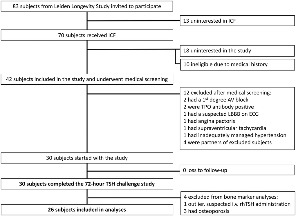 The inclusion flow chart of subjects for the study is presented in Figure 1. In total, 30 subjects from the Leiden Longevity Study participated in the rhTSH study. One subject (male offspring) was excluded from bone marker analysis due to suspected i.v. rhTSH administration. Three subjects (female controls) were excluded from bone marker analysis due to osteoporosis. Bone marker analysis was performed in 26 subjects (14 offspring and 12 controls).