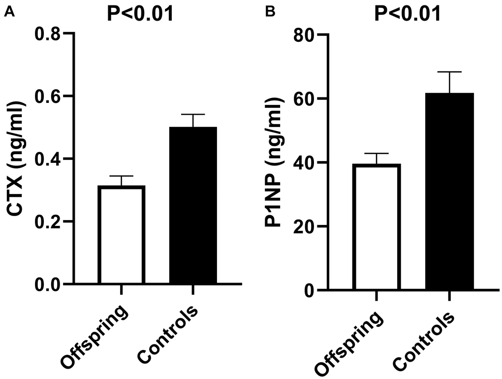 The bone markers were not different between men and women (CTX: mean (SEM) 0.36 (0.03) ng/ml and 0.45 (0.06) ng/ml respectively, p = 0.16; P1NP: mean (SEM) 42.8 (2.8) ng/ml and 58.2 (7.8) ng/ml respectively, p = 0.06). Both male and female offspring had lower bone markers than male and female controls. Within males, P1NP was significantly lower in offspring than in controls (mean (SEM) 36.7 (3.0) and 50.8 (3.0) ng/ml in offspring and controls respectively, p < 0.01), while CTX followed a similar trend (mean (SEM) 0.31 (0.04) and 0.42 (0.04) ng/ml in offspring and controls respectively, p = 0.10). Within females, CTX was lower in offspring than controls (mean (SEM) 0.32 (0.05) and 0.58 (0.08) ng/ml in offspring and controls respectively, p = 0.01), and P1NP followed the same trend (mean (SEM) 43.5 (6.6) and 72.8 (11.7) ng/ml in offspring and controls respectively, p = 0.05).