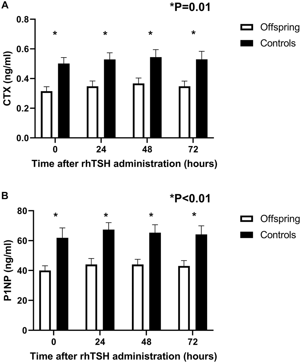 Despite the increase in bone markers following rhTSH administration, concentration of both CTX and P1NP remained lower in offspring than in controls throughout the study (CTX: p = 0.01, 0.01 and 0.01 at 24, 48 and 72 hours, respectively; P1NP: p = <0.01, <0.01 and <0.01 at 24, 48 and 72 hours, respectively).