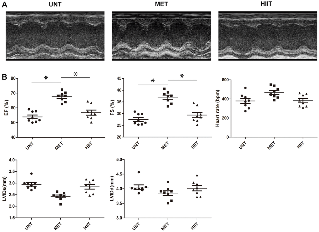To determine whether exercise training protects against cardiac damage, we examined parameters related to cardiac function in mice (Figure 1A). The untrained (UNT) mice exhibited impaired cardiac function, as evidenced by a decrease in the left ventricular rejection fraction and fraction shortening (LVEF and LVFS). These decreases were also observed in the HIIT group, but they were significantly abrogated in the MET group (Figure 1B).