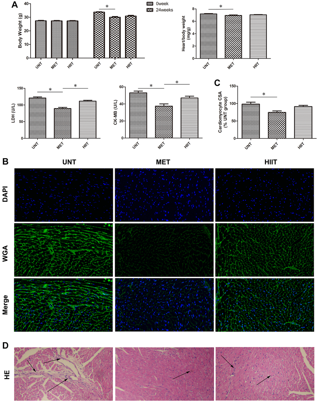 The mice in the UNT group showed considerably increased body weight (24 weeks), heart/body weight, serum lactate dehydrogenase (LDH), creatine kinase MB (CK-MB) levels, but these metrics were significantly decreased in the MET group (Figure 2A). Wheat-germ agglutinin (WGA) and hematoxylin and eosin (H and E) staining revealed cardiomyocyte hypertrophy and inflammatory cell infiltration. Compared with the MET group, the UNT group exhibited myocardial hypertrophy, as evidenced by increased cardiomyocyte cross-sectional area (CSA, Figure 2B–2C) and inflammatory cell infiltration (Figure 2D), both of which could be attenuated by MET.