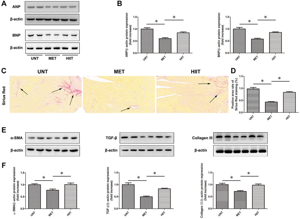 The levels of cardiac remodeling-associated biomarkers, including ANP and BNP, were significantly increased in the hearts of mice in the UNT group and decreased in the heart of mice in the MET group (Figure 3A–3B). Sirius Red staining was performed to assess cardiac tissue collagen deposition. Aging resulted in distinctive interstitial and perivascular fibrosis in the heart, which was attenuated by MET (Figure 3C–3D). Moreover, we used western blotting (Figure 3E–3F) to evaluate the levels of indicators related to myocardial fibrosis. An upregulation in the expression of collagen III, α-SMA, and TGF-β in cardiac tissues was observed in the UNT group and it was significantly attenuated by MET.
