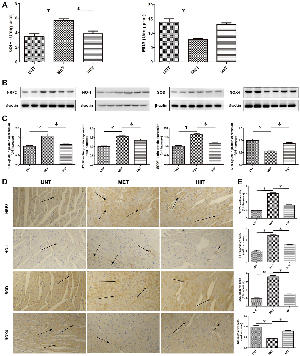 The malondialdehyde (MDA) level significantly increased in the UNT mouse heart, but the glutathione (GSH) level decreased compared with MET group mice, however, MET restored the GSH level and decreased the MDA level (Figure 4A). Moreover, we used western blotting (Figure 4B–4C) and immunohistochemistry (Figure 4D–4E) to evaluate the levels of indicators related to oxidative stress. The levels of NRF2, HO-1, and SOD were significantly downregulated in the UNT mouse heart, and MET restored these levels. Furthermore, the expression of NOX4 significantly increased in the UNT group, and it was attenuated by MET.